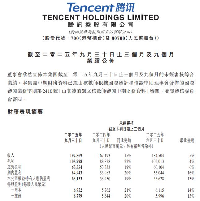 腾讯控股在港交所公告称,第三季度营收1,928.7亿元人民币,预估1,888亿元人民币;第三季度净利润631.3亿元人民币,预估558.8亿元人民币。