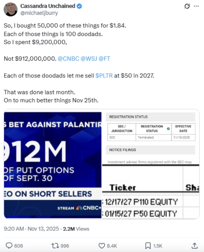 “9亿美元做空AI龙头”风波:大空头Burry辟谣并悄悄关闭旗下基金 炒股第一步,先开个股票账户 华尔街“大空头”大动作。 电影《大空头》主角原型、曾精准预言2008年美国次贷危机的投资大佬——Michael Burry,再度引发市场热议。据最新消息,Michael Burry宣布他管理的Scion基金已经从美国证券交易委员会撤销注册。此举意味着他不再为外部投资者服务,因此也不再需要公开披露其持仓或交易细节。 与此同时,Michael Burry还辟谣称,媒体报道的“9.12亿美元做空英伟达和AI大牛股Palantir”严重夸大,其真实投入仅有920万美元。 “大空头”紧急辟谣 北京时间11月13日晚间消息,华尔街“大空头”Michael Burry辟谣称,所谓的“9.12亿美元做空AI龙头”是数学错误——他真实投入的资金仅有920万美元。 Michael Burry在社交平台X上贴出截图,引用了美国消费者新闻与商业频道(CNBC)的一条报道标题:“Michael Burry持有价值9.12亿美元的Palantir看跌期权。” 他回应道:“我买了5万份看跌期权,每份价格1.84美元。每份合约对应100股股票。总共只花了920万美元,不是9.12亿美元。” ![]() 据CNBC此前报道,Michael Burry管理的Scion Asset Management最新披露的三季度13F报告显示,该公司针对Palantir的看跌期权名义价值高达9.12亿美元(相当于500万股),针对英伟达的看跌期权名义价值达1.86亿美元,两者合计占到了公司投资组合权重的80%。 这一差异来自13F持仓报告的披露方式。 在SEC文件中,机构必须按“名义价值”披露期权仓位,即按照标的股票市值计算的理论敞口。而媒体常将这一数字误解为实际投入资金。 以Michael Burry持仓为例,他购买的看跌期权对应500万股Palantir,当时股价约182美元,因此报告中显示的“名义规模”为9.12亿美元。但这只是潜在敞口,并非真实投入。 换言之,Michael Burry押注AI股的实际支出仅约900万美元出头。 他说道:“每份合约让我能在2027年以50美元的价格卖出Palantir股票。现在股价184美元,也就是说——市场比我‘目标价’贵了73%。而且相关交易上个月就已经完成了” 突然宣布:注销 除了“做空AI龙头”的风波,Michael Burry的另一个动作也备受市场关注:他已悄悄注销旗下对冲基金Scion Asset Management的SEC注册。 在致投资者信中,他宣布将清算基金并返还投资者资金,并提到对市场估值的失望。 另据美国证券交易委员会网站披露,Scion Asset Management的注册状态已于11月10日终止。Michael Burry本人随后在社交平台X上晒出截图,配文称“将于11月25日迎来更好的事”。 有投资者猜测,这可能意味着Michael Burry将彻底摆脱传统监管框架,转而创建新的独立平台——例如博客、订阅频道或交易跟踪服务,直接分享自己的投资观点。 一部分社交媒体用户甚至贴出疑似截图称,Michael Burry计划“在年底前向投资者返还资金,关闭基金”,但这一点尚未得到官方确认。 外界之所以关注Michael Burry,是因为他曾成功押注2008年美国次贷泡沫破灭。他的事迹还被拍成奥斯卡获奖电影《大空头》,成为那段市场浩劫的代表人物之一。 近两周时间里,他管理的Scion Asset Management先是提前放出13F表,显示分别持有AI软件和硬件大牛股Palantir、英伟达的看跌期权,在华尔街引发热议。 与此同时,Michael Burry在社交媒体上警告称,市场正处于泡沫状态,并指责美国科技巨头偷偷增加算力芯片的折旧时间,从而减少大规模投资对利润表的影响。 他警告称:“市场正被AI泡沫裹挟,像2000年互联网泡沫那样。” 目前看来,他发帖质疑折旧的时间点,已经完成了终止基金注册的手续。 对于Michael Burry为何要关闭基金,基于不同立场(以及持仓)的人也有不同的看法。 宏观策略分析团队EndGame Macro解读称,综合Michael Burry的帖子,他显然在把自己塑造成那个2005年坐在一堆次贷产品说明书前的那个人。那时他看到机构将拙劣抵押品包装成AAA级结构化产品,而他现在看到的是由资本支出和会计选择支撑的万亿美元市值。因此他现在选择“退场”,最有可能的原因是不希望再经历一次疯狂“泡沫”末端的艰难拉锯——既然基金管理人的判断与市场现实差别这么大,作为受托人,最诚实的做法就是把钱还回去。 想炒股,先开户!选丁冬财经证券,行情交易一个APP搞定>> (文章来源:券商中国) |