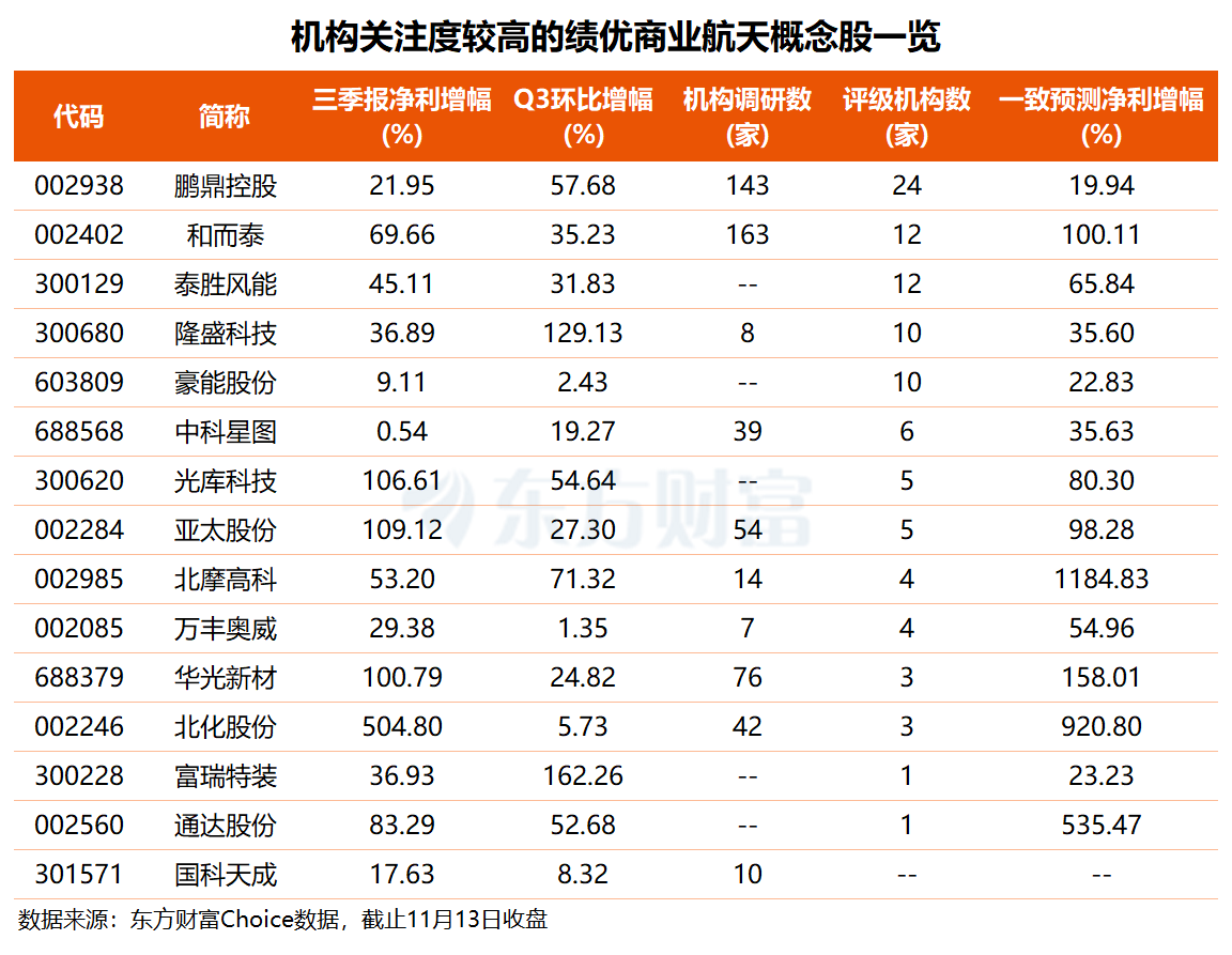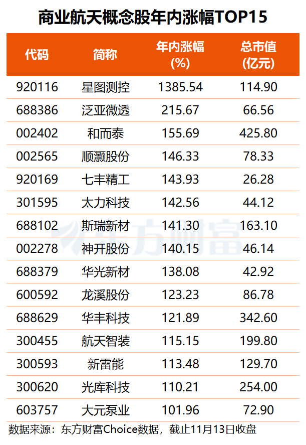 中国版“猎鹰9号”首飞在即 在火箭发射环节,国内可重复使用运载火箭进度也在加速。 据界面新闻报道,蓝箭航天旗下火箭“朱雀三号”将于11月中下旬首飞。在此之前,国内尚未有一款可回收火箭完成过发射任务。“朱雀三号”有望成为我国第一款投入运营的可回收运载火箭。 据悉,“朱雀三号”是全球首款全不锈钢液氧甲烷火箭,“不锈钢+甲烷”的组合更注重复用寿命和未来可扩展性,这一设计与SpaceX的“星舰”在技术路线相近。发射成本方面,“朱雀三号”目标是将成本降至每公斤20000元以内,基本与“猎鹰9号”的3000美元/公斤成本相当。 业内人士指出,“朱雀三号”一旦成功首飞,将大幅降低国内商业航天的发射成本,有望成为中国商业航天从“技术验证”迈向“商业运营”的分水岭。 此外,卫星互联网牌照逐步发放,也有望推动商业航天全产业链向规模化加速迈进。星座运营位于产业链的下游环节,直接决定了卫星制造、火箭发射、地面设备等中上游环节的需求规模,明确的运营主体和业务规范将为整个产业链的可持续发展提供支撑。 多频共振下板块迎投资机遇 在政策端,近年来,我国陆续出台一系列政策,推动商业航天高质量发展。 国家层面,“十五五”规划建议中提到,加快建设航天强国;实施产业创新工程,一体推进创新设施建设、技术研究开发、产品迭代升级,加快航空航天等战略性新兴产业集群发展。2025年《政府工作报告》也提出,新培育一批国家级先进制造业集群,商业航天、北斗应用、新型储能等新兴产业快速发展。 地方层面,广东、山东分别印发《广东省推动商业航天高质量发展若干政策措施(2025—2028年)》《山东省加快推动商业航天产业高质量发展的若干措施》,均提到将充分发挥当地优势,支持商业航天发展。黑龙江省“十五五”规划建议提出,打造新兴支柱产业,发展壮大高端装备、航空航天、新材料等千亿级产业集群;力争航空航天、电子信息、新材料、高端装备、智能农机等战略性新兴产业总规模达到5000亿元。 国泰海通此前在研报中指出,多个星座进入大规模组网阶段,可重复使用火箭技术、大型液体火箭技术突破,海南商发二期工程加速推进,终端应用场景落地与投融资渠道拓宽。需求爆发、技术创新、场景突破共振,我国商业航天产业迎来规模化发展机遇。 华泰证券也认为,商业航天板块迎来“政策面”“业绩面”和“技术面”的三重拐点,建议关注商业航天板块性投资机遇。 东吴证券预计,到2030年,我国商业航天市场规模将达到7.8万亿元。万亿蓝海市场下,商业航天投资机遇可期,对标美国SpaceX 2016-2025十年间市值增长约40倍至4000亿美元,国内商业航天核心产业链环节亦有望孕育出百亿甚至千亿估值的本土龙头。 15只概念股年内股价翻倍 东方财富概念板块显示,目前A股市场共有169只商业航天概念股,合计总市值达2.11万亿元,近九成商业航天概念股年内股价上涨,其中星图测控区间涨幅居首,航天智装、斯瑞新材等十余股股价翻倍;航宇科技、中国卫星、上海沪工等均有不错表现。 资料显示,斯瑞新材已启动建设“液体火箭发动机推力室材料、零件、组件产业化项目”,以新材料、新工艺全力服务商业航天行业发展。今年前三季度,公司实现营收11.74亿元,同比增长21.74%;归母净利润为1.23亿元,同比增长37.34%。 华龙证券指出,随着我国商业航天产业化加速落地,斯瑞新材作为蓝箭航天核心供应商,有望直接受益,相关业务维持高速增长。根据公司三季报披露,公司研发投入、经营用资金维持高增,预计规模将持续扩大。 ![]() 绩优概念股名单出炉 在业绩层面,共有93只商业航天概念股今年前三季度净利实现正增长(含扭亏为盈),楚江新材、硕贝德增幅居首,智明达、航天科技、长盈通三股同比增长超9倍,北斗星通、三维通信、西菱动力等20余股净利增幅均在100%以上。 值得注意的是,前三季度净利同比增长、净利润规模超1亿元且第三季度净利环比增长的共有15只商业航天概念股,包括鹏鼎控股、和而泰、亚太股份、中科星图、富瑞特装、泰胜风能等。 股价方面,上述15股中,光库科技、华光新材、和而泰三股年内股价涨超100%,但也有国科天成、北摩高科、泰胜风能、中科星图、富瑞特装五股的区间涨幅低于30%。 机构关注度方面,上述15股中,有14股近半年获得机构评级,其中,鹏鼎控股近半年获24家机构给予评级,和而泰、豪能股份、隆盛科技、泰胜风能等4股的评级机构数均上双。机构预测北摩高科、北化股份、通达股份、华光新材、和而泰等全年净利同比将大幅增长。 泰胜风能近日在互动平台上表示,公司在积极推动商业航天业务,开展贮箱产线建设、团队搭建、专家引进、市场调研等前期工作,截至目前尚未对星河动力供货。 中国银河证券此前研报指出,泰胜风能与国内整箭制造商签署战略合作协议,在火箭箭体结构、贮箱产品,火箭发射、回收设施等研发、设计、制造以及新型技术和应用方面规划布局,通过子公司泰胜航天切入商业航天战略新兴行业赛道,有望打造新增长曲线。 中科星图于今年7月提出“一体两翼”空天地全覆盖的发展规划,“一体”即强化公司数字地球核心能力平台建设,“两翼”则聚焦商业航天和低空经济两大新兴领域,拓展空天信息新赛道。 中原证券表示,看好公司在星图云和数字地球的业务