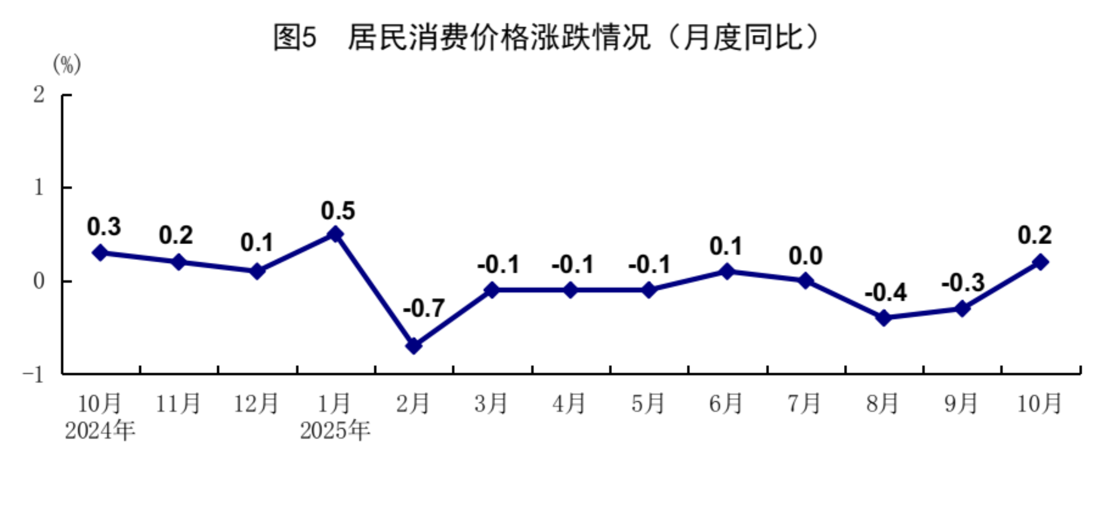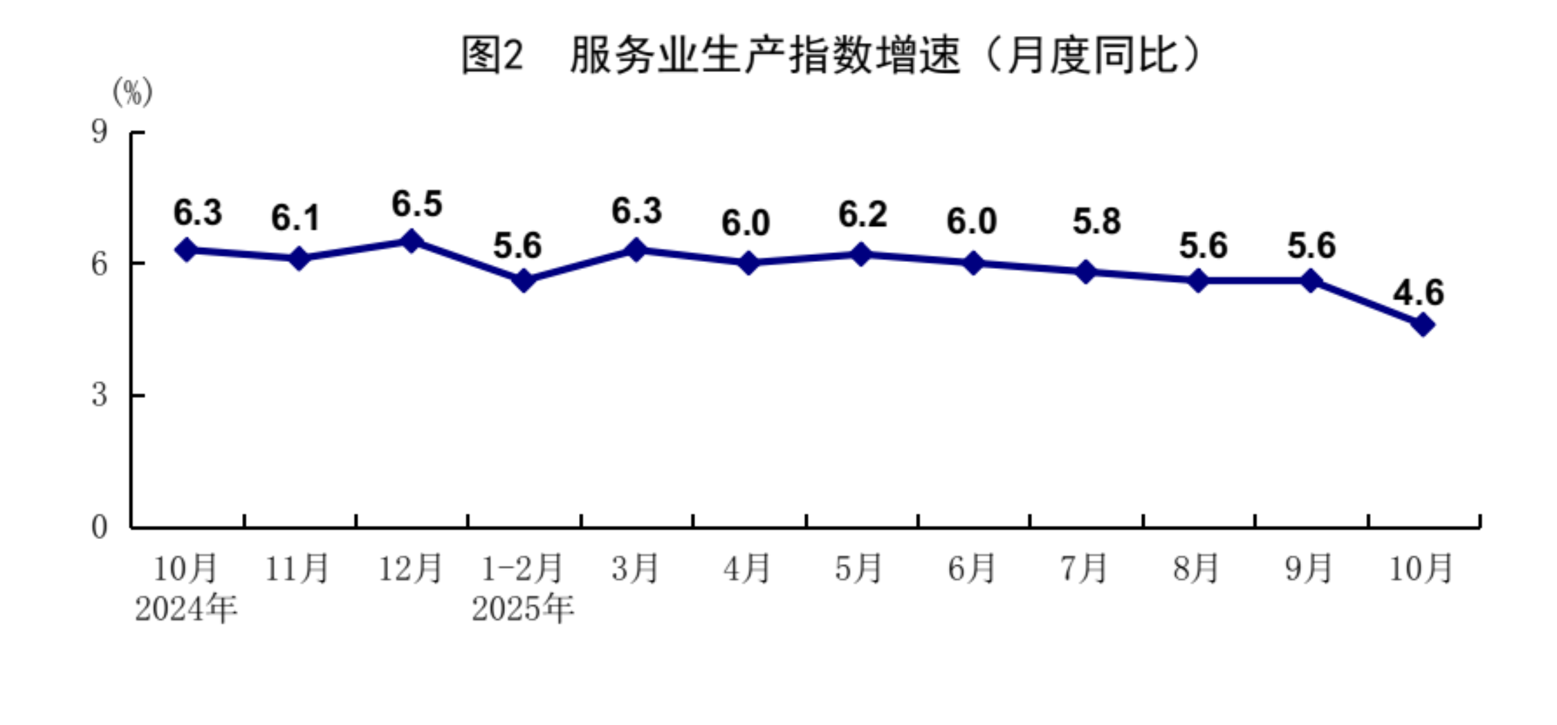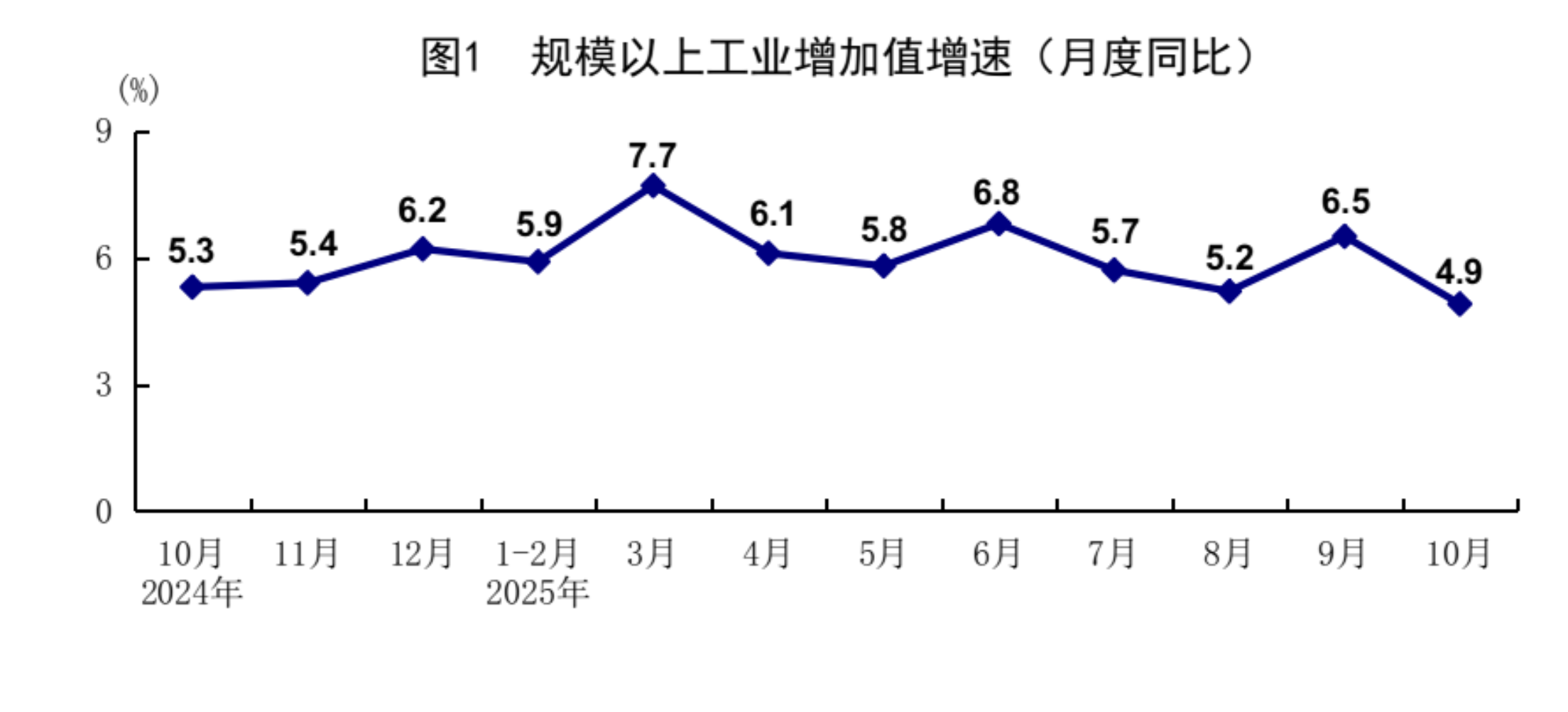 10月份,在以习近平同志为核心的党中央坚强领导下,各地区各部门认真贯彻落实党中央、国务院决策部署,坚持稳中求进工作总基调,加力稳就业、稳企业、稳市场、稳预期,纵深推进全国统一大市场建设,积极畅通国内国际双循环,生产供给基本平稳,就业总体稳定,物价有所改善,新动能培育壮大,国民经济保持总体平稳、稳中有进发展态势。 一、工业生产持续增长,装备制造业和高技术制造业增势较好 10月份,全国规模以上工业增加值同比增长4.9%,环比增长0.17%。分三大门类看,采矿业增加值同比增长4.5%,制造业增长4.9%,电力、热力、燃气及水生产和供应业增长5.4%。装备制造业增加值同比增长8.0%,高技术制造业增加值增长7.2%,分别快于全部规模以上工业增加值3.1和2.3个百分点。分经济类型看,国有控股企业增加值同比增长6.7%;股份制企业增长5.2%,外商及港澳台投资企业增长4.0%;私营企业增长2.1%。分产品看,3D打印设备、新能源汽车、工业机器人产品产量同比分别增长30.8%、19.3%、17.9%。1-10月份,全国规模以上工业增加值同比增长6.1%。10月份,制造业采购经理指数为49.0%,企业生产经营活动预期指数为52.8%。1-9月份,全国规模以上工业企业实现利润总额53732亿元,同比增长3.2%。 ![]() 二、服务业平稳增长,现代服务业发展良好 10月份,全国服务业生产指数同比增长4.6%。分行业看,信息传输、软件和信息技术服务业,租赁和商务服务业,金融业生产指数同比分别增长13.0%、8.2%、5.6%,分别快于服务业生产指数8.4、3.6、1.0个百分点。1-10月份,全国服务业生产指数同比增长5.7%。1-9月份,规模以上服务业企业营业收入同比增长7.6%。10月份,服务业商务活动指数为50.2%,服务业业务活动预期指数为56.1%。其中,铁路运输、航空运输、邮政、住宿、文化体育娱乐等行业商务活动指数位于60.0%及以上高位景气区间。 ![]() 三、市场销售规模扩大,服务零售增长加快 10月份,社会消费品零售总额46291亿元,同比增长2.9%;环比增长0.16%。按经营单位所在地分,城镇消费品零售额40021亿元,同比增长2.7%;乡村消费品零售额6270亿元,增长4.1%。按消费类型分,商品零售额41092亿元,增长2.8%;餐饮收入5199亿元,增长3.8%。基本生活类和部分升级类消费较快增长,限额以上单位粮油食品类、通讯器材类、文化办公用品类、体育娱乐用品类商品零售额同比分别增长9.1%、23.2%、13.5%、10.1%。1-10月份,社会消费品零售总额412169亿元,同比增长4.3%。全国网上零售额127916亿元,同比增长9.6%。其中,实物商品网上零售额103984亿元,增长6.3%,占社会消费品零售总额的比重为25.2%。1-10月份,服务零售额同比增长5.3%,增速比前三季度加快0.1个百分点。其中,文体休闲服务类、通讯信息服务类、旅游咨询租赁服务类、交通出行服务类零售额较快增长。 ![]() 四、固定资产投资同比下降,制造业投资持续增长 1-10月份,全国固定资产投资(不含农户)408914亿元,同比下降1.7%;扣除房地产开发投资,全国固定资产投资增长1.7%。分领域看,基础设施投资同比下降0.1%,制造业投资增长2.7%,房地产开发投资下降14.7%。全国新建商品房销售面积71982万平方米,同比下降6.8%;新建商品房销售额69017亿元,下降9.6%。分产业看,第一产业投资同比增长2.9%,第二产业投资增长4.8%,第三产业投资下降5.3%。民间投资同比下降4.5%;扣除房地产开发投资,民间投资增长0.2%。高技术产业中,信息服务业,航空、航天器及设备制造业,计算机及办公设备制造业投资同比分别增长32.7%、19.7%、4.1%。10月份,固定资产投资(不含农户)环比下降1.62%。 ![]() 五、货物进出口保持增长,贸易结构继续优化 10月份,货物进出口总额37028亿元,同比增长0.1%。其中,出口21716亿元,下降0.8%;进口15311亿元,增长1.4%。1-10月份,货物进出口总额373090亿元,同比增长3.6%。其中,出口221146亿元,增长6.2%;进口151944亿元,同比持平。1-10月份,一般贸易进出口增长2.3%,占进出口总额的比重为63.4%。对共建“一带一路”国家进出口增长5.9%。民营企业进出口增长7.2%,占进出口总额的比重为57.0%,比上年同期提高1.9个百分点。机电产品出口增长8.7%,占出口总额的比重为60.7%。 六、就业形势总体稳定,城镇调查失业率下降 1-10月份,全国城镇调查失业率平均值为5.2%。10月份,全国城镇调查失业率为5.1%,比上月下降0.1个百分点。本地户籍劳动力调查失业率为5.3%;外来户籍劳动力调查失业率为4.7%,其中外来农业户籍劳动力调查失业率为4.5%。31个大城市城镇调查失业率为5.1%,比上月下降0.1个百分点。全国企业就业人员周平均工作时间为48.4小时。 七、居民消费价格由降转涨,工业生产者价格降幅收窄 10月份,全国居民消费价格(CPI)同比上涨0.2%,上月为下降0.3%;环比上涨0.2%。分类别看,食品烟酒价格同比下降1.6%,衣着价格上涨1.7%,居住价格上涨0.1%,生活用品及服务价格上涨1.9%,交通通信价格下降1.5%,教育文化娱乐价格上涨0.9%,医疗保健价格上涨1.4%,其他用品及服务价格上涨12.8%。在食品烟酒价格中,猪肉价格下降16.0%,鲜菜价格下降7.3%,鲜果价格下降2.0%,粮食价格下降0.7%。扣除食品和能源价格后的核心CPI同比上涨1.2%,涨幅比上月扩大0.2个百分点。1-10月份,全国居民消费价格同比下降0.1%。 ![]() 10月份,全国工业生产者出厂价格同比下降2.1%,降幅比上月收窄0.2个百分点,环比上涨0.1%;全国工业生产者购进价格同比下降2.7%,降幅收窄0.4个百分点,环比上涨0.1%。1-10月