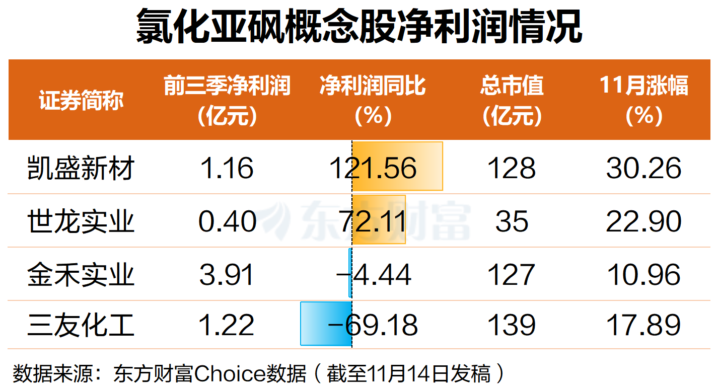 11月14日,A股氯化亚砜概念股早盘集体高开,凯盛新材高开近10%,金禾实业高开近4%,世龙实业高开超5%,三友化工小幅高开。消息方面,氯化亚砜近期价格暴涨。据生意社数据,99%氯化亚砜最新报价1600元/吨,单日涨幅近4%。自10月末至今,约半个月的时间里该品种累计涨幅已超45%。 ![]() 数据来源:生意社 公开资料显示,双氟磺酰亚胺锂(LiFSI)多用于高镍三元、高压、快充及高温/低温等高性能电池,常与六氟磷酸锂混合使用,以兼顾铝箔保护与性能提升。不过,随着六氟磷酸锂价格的暴涨,其最新价已达到13万元/吨,成本优势明显缩小,双氟磺酰亚胺锂将对六氟磷酸锂产生替代效应。 ![]() 图片来源:凯盛新材公告(氯化亚砜是生产LiFSI的重要原材料) 双氟磺酰亚胺锂上游原材料主要包含有氯化亚砜、氢氟酸、碳酸二甲酯、二氯甲烷等。氯化亚砜分子式为SOCl2,作为优良的氯化剂被应用在医药、农药、染料、食品添加剂以及锂电池等行业。据凯盛新材公告,每吨LiFSI消耗2.5吨氯化亚砜,双氟磺酰亚胺锂对六氟磷酸锂的替代效应将催生氯化亚砜的需求。 ![]() 图片来源:OFweek 目前,六氟磷酸锂(LiPF6)占据电解液溶质市场主导地位,但其存在化学性质不稳定、低温环境下效率受限等缺点,LiFSI则具有高导电率、高化学稳定性、高热稳定性,以LiFSI为锂盐的电解液将更能满足未来电池性高能量密度以及宽工作温度的发展需求,被认为是LiPF6的良好替代品。 ![]() 图片来源:开源证券 据不完全统计,A股氯化亚砜概念股共计4只,分别为凯盛新材、金禾实业、世龙实业和三友化工,随着氯化亚砜价格暴涨,相关概念股也受到市场热捧,股价集体走强。截至11月14日发稿,月内凯盛新材已涨超30%,世龙实业涨超20%,三友化工金禾实业均涨超10%。 ![]() 凯盛新材是全球氯化亚砜行业龙头,拥有高达15万吨/年的产能,占据全球市场份额的26%以上。公司建立了以氯、硫基础化工原料为起点,逐步延伸至精细化工中间体氯化亚砜、进一步延伸到高性能芳纶纤维的聚合单体间/对苯二甲酰氯、对硝基苯甲酰氯等,再到高性能高分子材料聚醚酮酮(PEKK)及其相关功能性产品的立体产业链结构。 金禾实业现有氯化亚砜产能8万吨/年,年产10万吨氯化亚砜项目的建设工作正有序推进。公司7月25日表示,年产1万吨新一代锂盐双氟磺酰亚胺锂核心前驱体——双氯磺酰亚胺酸生产装置近期投产。 世龙实业主营AC发泡剂、氯化亚砜、氯碱等化工产品的研发、生产和销售。其中,氯化亚砜年产能稳定在5万吨。世龙实业表示,少部分产品涉及锂电池等新能源行业。 三友化工2023年7月时公告,公司全资子公司唐山三友精细化工有限公司2023年拟在曹妃甸工业区化学工业园区投资建设年产4万吨氯化亚砜、年产5万吨氯乙酸、年产9.8万吨烧碱项目。今年5月份公司表示,精细化工一期项目即年产4万吨氯化亚砜等项目建设进展顺利,预计今年四季度建成。 (文章来源:东方财富研究中心) |