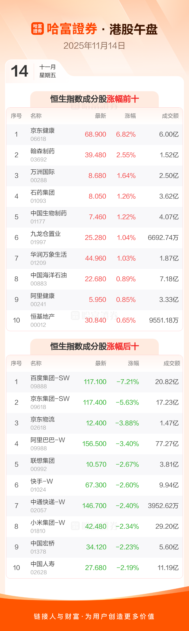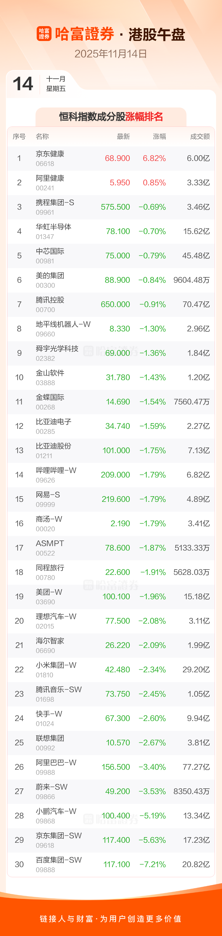 港股11月14日午盘走低,恒生指数收报26732.99点,跌340.04点,跌幅1.26%;恒生科技指数收报5849.61点,跌131.69点,跌幅2.2%。恒生指数成分股中京东健康、翰森制药、万洲国际涨幅居前,百度集团-SW、京东集团-SW、京东物流跌幅靠前。恒生科技指数成分股中京东健康、阿里健康、携程集团-S涨幅居前,百度集团-SW、京东集团-SW、小鹏汽车-W跌幅靠前。