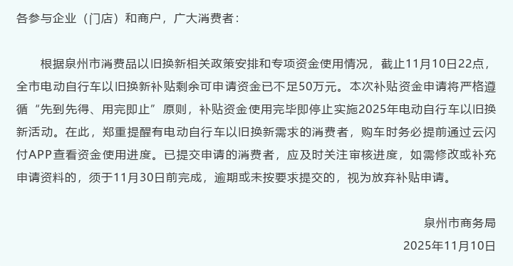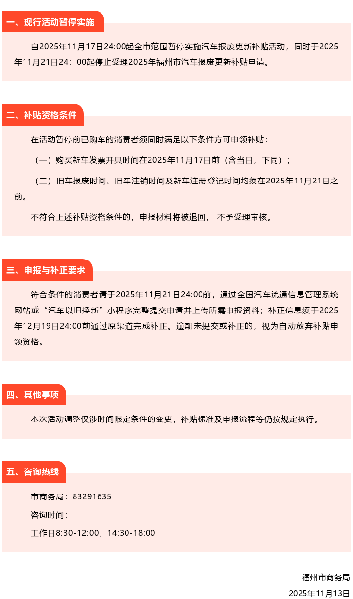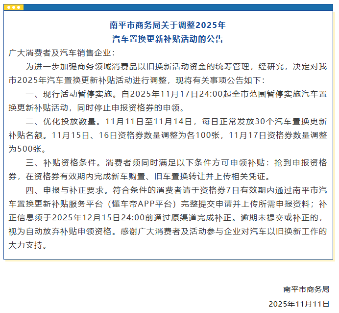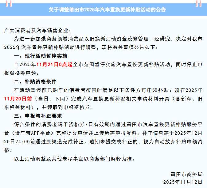 福建多地公告:将暂停汽车置换更新等补贴 在丁冬财经看资讯行情,选丁冬财经证券一站式开户交易>> “福建发布”官微消息,福建多地公告,将暂停汽车置换更新等补贴。 福州自2025年11月17日24:00起,全市范围暂停实施汽车报废更新补贴活动,同时于2025年11月21日24:00起,停止受理2025年福州市汽车报废更新补贴申请。 具体公告如下↓ ![]() 泉州即将停止实施2025年电动自行车以旧换新活动,具体公告如下↓ ![]() 三明家电以旧换新、3C数码购新家装厨卫焕新、汽车置换更新即将暂停实施补贴政策,具体公告如下↓ ![]() 莆田自2025年11月21日0时起,全市范围暂停实施汽车置换更新补贴活动,同时停止申报资格券申领。具体公告如下↓ ![]() 另外自2025年11月15日0时起,全市范围内暂停实施电动自行车以旧换新补贴活动,同步停止电动自行车以旧换新补贴“立购立减”资格券申领。具体公告如下↓ ![]() 南平自2025年11月17日24:00起,全市范围暂停实施汽车置换更新补贴活动,同时停止申报资格券的申领。具体公告如下↓ ![]() (文章来源:界面新闻) |