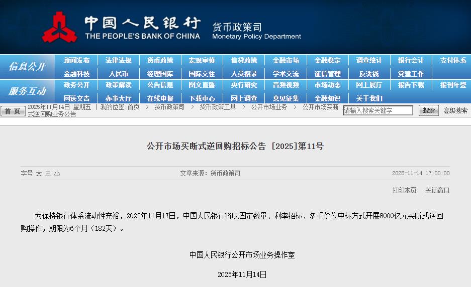 为保持银行体系流动性充裕,2025年11月17日,中国人民银行将以固定数量、利率招标、多重价位中标方式开展8000亿元买断式逆回购操作,期限为6个月(182天)。