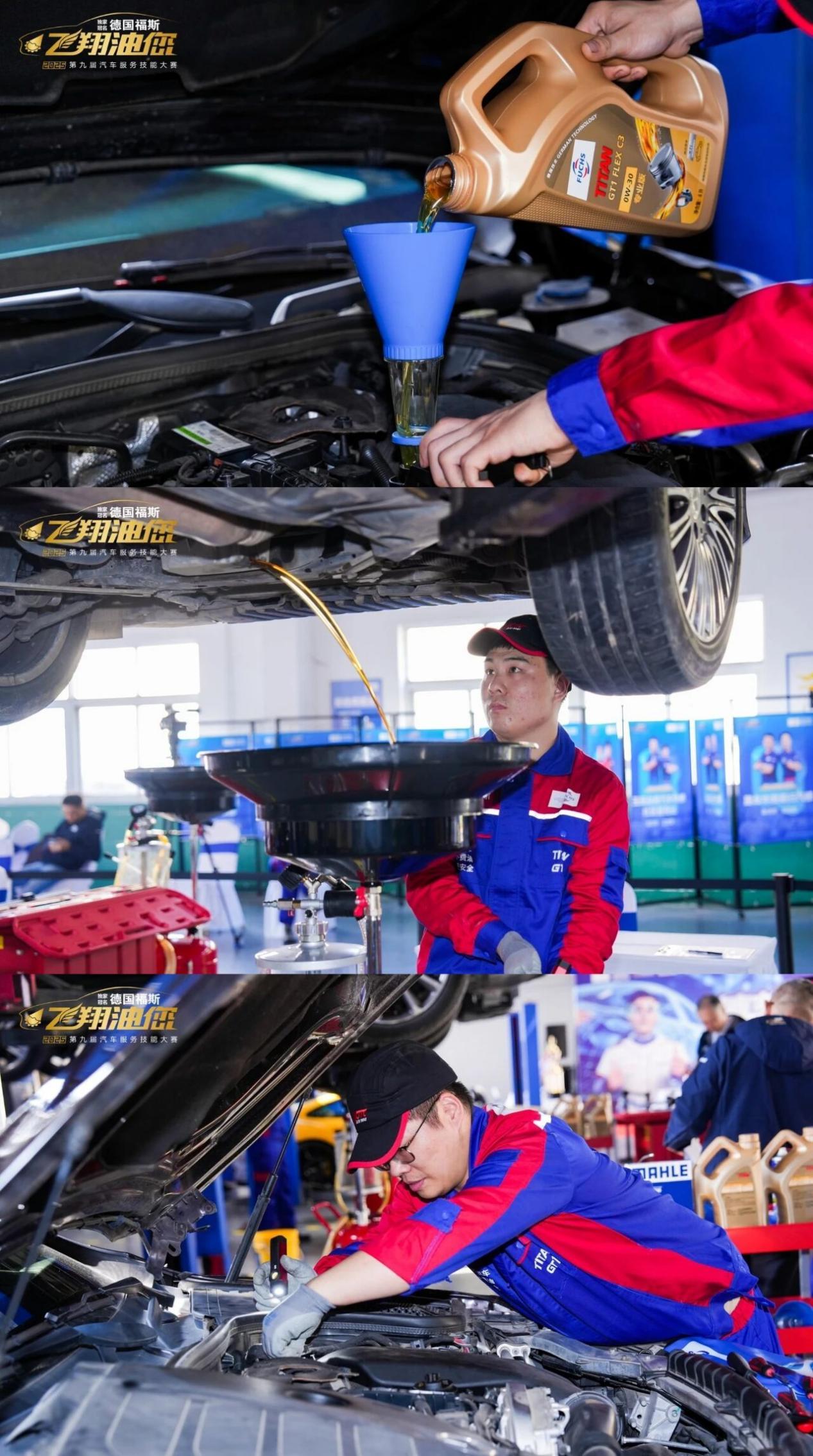 二、双赛道比拼,硬核实力诠释专业底色 热身环节结束后,总决赛进入实操比拼阶段。本次决赛分为技术组与接待组,共计三轮专项考核,全程参照真实汽车服务场景设置竞赛内容,全方位检验选手的专业硬实力。 技师组考核内容涵盖30项全车检测、底盘深度排查、标准化保养实操等多个核心模块,各个模块又细分。这意味着选手们不仅需要熟练掌握操作技能,更要具备严谨细致的工作态度,只有日积月累的实战积淀,才能在高强度的比拼中精准完成每一个操作流程。 值得一提的是,赛事特别强调"精准施工"理念,这正是福斯希望通过赛事传递的核心服务准则,让"精准用油"深植于每一位汽修人的匠心之中。