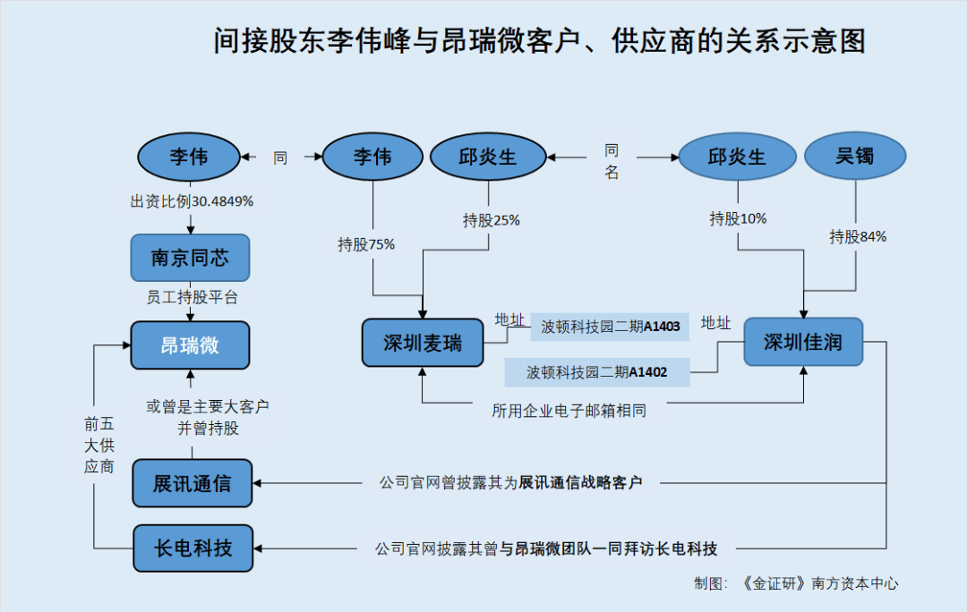 截至查询日2025年11月12日,深圳麦瑞思官网显示,麦瑞思(Wellstec)成立于2015年,是智能手机和智能手表设计ODM厂商。 同时,深圳佳润鑫官网显示,深圳佳润鑫专注于移动终端、智能穿戴解决方案,致力于打造一流的开放的ODM平台。 另外,深圳佳润鑫在公开招聘平台发布的信息显示,深圳佳润鑫专注于手机、智能穿戴ODM代工,其发布的公司相册显示,其前台背景墙上同时并排标示深圳佳润鑫、深圳麦瑞思的标识。 综上情形,深圳麦瑞思、深圳佳润鑫从事的业务或存重叠,均涉及手机及智能穿戴,两者或在同一处经营办公。 2.3 深圳佳润鑫称系展讯通信战略客户,曾与昂瑞微一同拜访长电科技 据深圳佳润鑫官网发布的内容,深圳佳润鑫获得2016年展讯通信战略客户奖。2017年8月,深圳佳润鑫获得展讯通信战略合作伙伴奖。 另外,据深圳佳润鑫官网2017年8月29日发布的关于“莅临长电科技(600584)”现场照片,江苏长电科技股份有限公司(以下简称“长电科技”)在其公司形象樯LED屏幕上播放了“热烈欢迎深圳佳润鑫&中科汉天下团队莅临长电科技”字样。 需要指出的是,2019年9月4日前,昂瑞微公司名称为“北京中科汉天下电子技术有限公司”。 即深圳佳润鑫或曾与彼时名为“中科汉天下”的昂瑞微一同拜访长电科技。 2.4 展讯通信或曾是昂瑞微主要大客户,而长电科技为昂瑞微前五供应商之一 据签署于2025年10月15日的招股书,2022年、2024年及2025年1-6月,长电科技均为昂瑞微前五大供应商,昂瑞微对其采购金额为11,476.35万元、19,797.87万元、6,151.64万元,采购内容主要为封测服务。 2022-2024年及2025年1-6月,昂瑞微披露的前五大客户未包括展讯通信。 2014年12月,昂瑞微与股东签署的投资协议,各方就股权回购权事项约定,出现下列情形之一时,权利方有权要求昂瑞微以现金方式回购权利方所持的全部或部分昂瑞微股权,列示的情形包括“2015年、2016年昂瑞微收入、净利润来源于展讯通信的部分分别大于40%、20%”。 可见,展讯通信或曾是昂瑞微的主要大客户。 简言之,2016年12月,外部投资人李伟峰通过昂瑞微员工持股平台南京同芯入股,其为南京同芯第一大合伙人。研究发现,昂瑞微间接股东李伟峰与深圳麦瑞思的控股股东李伟峰“同名”。且深圳麦瑞思与深圳佳润鑫上演经营混淆异象。其中,深圳佳润鑫官网曾披露,其为展讯通信的战略客户,并曾与昂瑞微一同拜访长电科技。而长电科技系昂瑞微前五大供应商,展讯通信则或曾是昂瑞微的大客户。在此情况下,展讯通信曾系清华大学控制的下属企业,曾于2015年3月入股昂瑞微,而后于2017年11月退股。