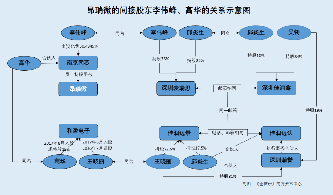 即在高华、李伟峰作为外部投资人,一同入股昂瑞微员工持股平台南京同芯。这背后,深圳麦瑞思控股股东李伟峰、和盈电子股东高华,又恰好与名为王晓丽的人员存在交集。 2.6 高华系和盈电子少数股东,王晓丽与和盈电子的终端客户存共同投资 上述提及,2017年8月,王晓丽、高华一同变更成为和盈电子少数股东,后王晓丽于2025年7月退股。截至查询日2025年11月12日,高华持有和盈电子15%股权。 据市场监督管理局数据,截至查询日2025年11月12日,和盈电子的经营范围为电子物料及周边材料购销、国内贸易、经营进出口业务。 据上海芯导电子科技股份有限公司(以下简称“芯导科技”)上市申报文件,报告期内2018-2020年及2021年1-6月,和盈电子系芯导科技TVS产品的经销商客户。和盈电子采购的TVS产品应用于手机、IoT、穿戴设备。 另外,歌尔微电子股份有限公司(以下简称“歌尔微”)上市申报文件显示,2023年1-6月,和盈电子系歌尔微经销商,歌尔微主要向和盈电子销其他MEMS传感器、消费电子麦克风产品,前述产品对应的终端客户主要为深圳市天珑移动技术有限公司(以下简称“天珑移动”)、四川易景智能终端有限公司。 据市场监督管理局数据,深圳市珑莹咨询合伙企业(有限合伙)(以下简称“深圳珑莹”)2021年12月10日设立,截至查询日2025年11月12日,由诺富投资、深圳市慧珑科技有限公司(以下简称“慧珑科技”)各持股50%。 其中,慧珑科技系天珑移动的全资子公司。 而前述提及,诺富投资的股东包括刘孝福、王晓丽,其中刘孝福系和盈电子持股85%的股东。 也就是说,和盈电子或主要从事电子材料及电子产品的经销、贸易业务。而和盈电子控股股东刘孝福,以及王晓丽等人通过诺富投资,与天珑移动全资子公司慧珑科技共同投资深圳珑莹。而天珑移动系和盈电子的终端客户之一。 值得一提的是,天珑移动官网显示,截至查询日2025年11月12日,其主要提供智能手机等消费电子产品ODM服务。 据签署于2025年10月15日的招股书,昂瑞微主要从事射频前端芯片、射频SoC芯片及其他模拟芯片的研发、设计与销售。其中,射频前端芯片下游应用领域主要为智能手机终端,并正在重点拓展智能汽车领域。射频SoC芯片下游应用领域主要为无线外设、智能家居等消费类应用和健康医疗、智慧物流、智能零售、智能表计等专业类应用。 简言之,天珑移动、深圳麦瑞思、深圳佳润鑫等企业,或与昂瑞微处于同一产业链,其中,深圳麦瑞思、深圳佳润鑫从事的业务或存重叠,均涉及手机及智能穿戴。而昂瑞微射频前端芯片下游应用领域主要为智能手机终端。此外,名为李伟峰、高华、王晓丽的自然人等背景牵涉天珑移动、深圳麦瑞思、深圳佳润鑫等企业。与此同时,昂瑞微员工持股平台均存在名为李伟峰、高华合伙人,且为外部投资者。基于上述情形,昂瑞微的外部投资股东,与前述企业之间关系或值得关注。 三、结语 此番上市,发行前,实控人钱永学控制的北京鑫科系瑞昂微第一大直接股东。回溯历史沿革,国资企业展讯通信2015年入股昂瑞微,而后在2017年11月退股。这背后,北京鑫科受让原国资股东展讯通信所持股权,半年后北京鑫科对外转让股权,该次股权转让价格或系北京鑫科受让展讯通信所持昂瑞微股权价格的一倍。 另一面,南京同芯合伙人包括李伟峰、高华,两人均系外部投资人。2016年12月,李伟峰通过昂瑞微员工南京同芯持股平台入股昂瑞微,其为南京同芯第一大合伙人。而同名的“李伟峰”的相关企业或曾系展讯通信的战略客户,并曾与昂瑞微一同拜访昂瑞微供应商。据昂瑞微申报文件披露,展讯通信则或曾是昂瑞微的大客户。除此之外,同名的“高华”的相关企业或系昂瑞微所处产业链的下游,且高华、李伟峰均与自然人王晓丽或存“交集”。 免责声明:本研究分析系基于我们认为可靠的或已公开的信息撰写,我们不保证文中数据、资料、观点或陈述不会发生任何变更。在任何情况下,本研究分析中的数据、资料、观点、或所表述的意见,仅供信息交流、分享、参考,并不构成对任何人的投资建议。在任何情况下,我们不对任何人因使用本研究分析中的任何数据、资料、观点、内容所引致的任何损失负任何责任,阅读者自行承担风险。本研究分析,主要以电子版形式分发,也会辅以印刷品形式分发,版权均归金证研所有。未经我们同意,不得对本研究分析进行任何有悖原意的引用、删节和修改,不得用于营利或用于未经允许的其它用途。 -END- 本文首发于微信公众号:金证研。文章内容属作者个人观点,不代表和讯网立场。投资者据此操作,风险请自担。 (责任编辑:宋政 HN002)