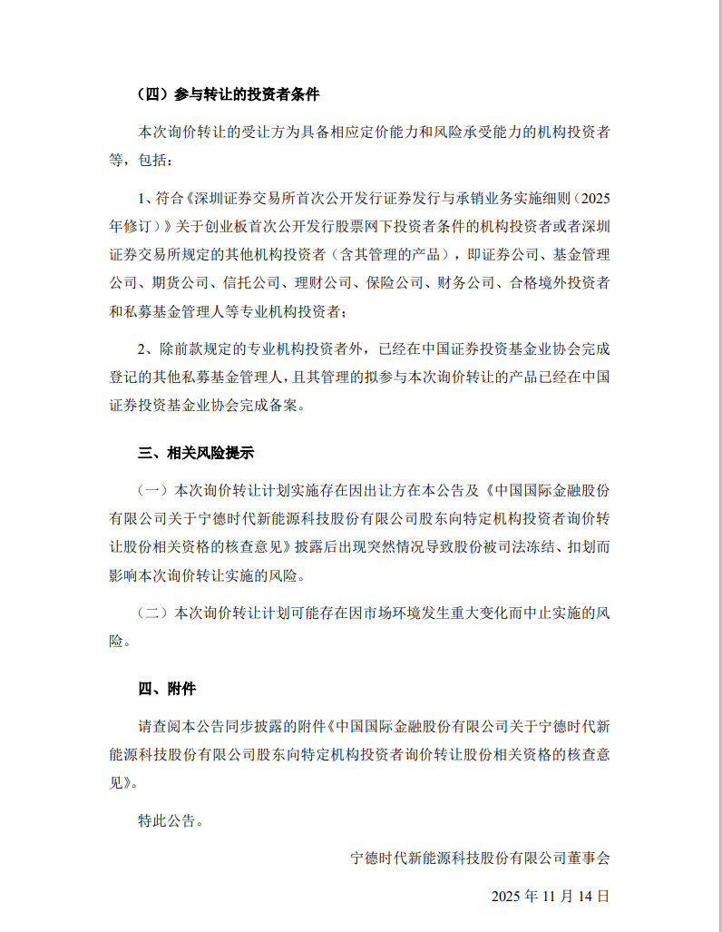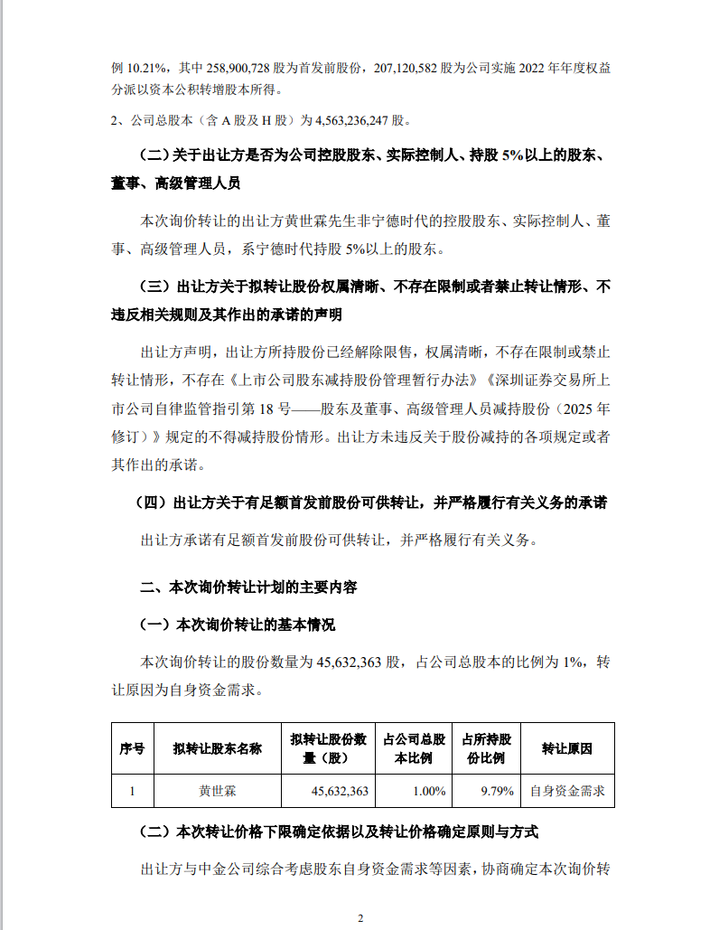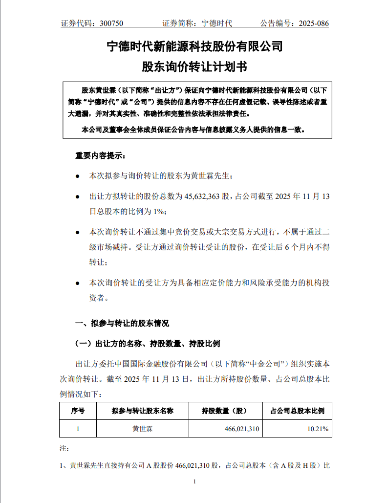 宁德时代(300750.SZ)公告称,股东黄世霖计划通过询价转让方式转让4563.24万股股份,占公司总股本的1%。此次转让不通过集中竞价交易或大宗交易方式进行,受让方在受让后6个月内不得转让。黄世霖直接持有公司A股股份4.66亿股,占公司总股本的10.21%,其中2.59亿股为首发前股份。转让原因为自身资金需求。