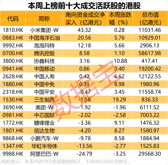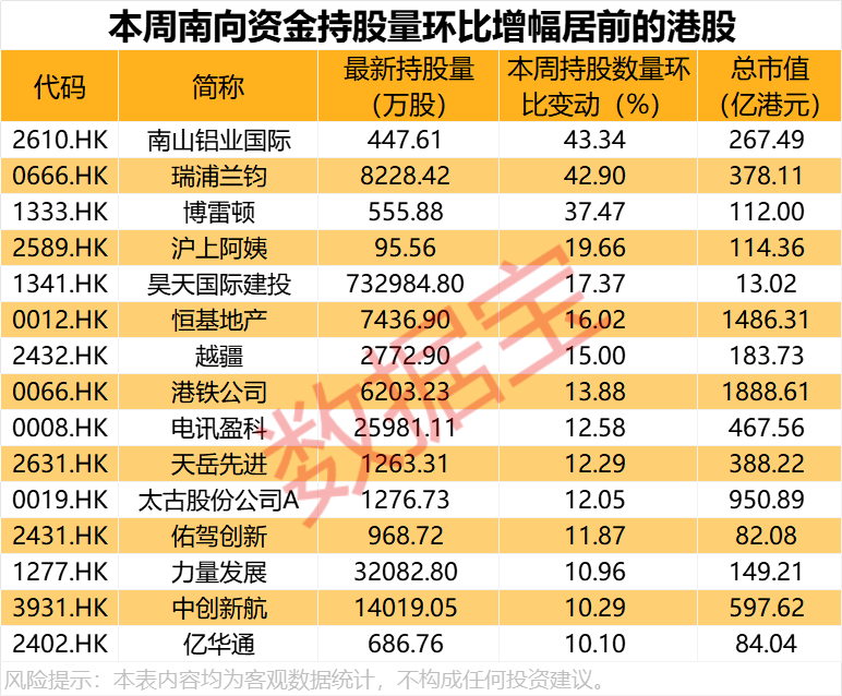 本周15股获得南向资金持股量环比增长超10%。 小米集团获南向资金净买入超40亿港元 本周(11月10日至14日)港股市场主要股指涨跌不一,恒生指数累计上涨1.26%,恒生科技指数下跌0.42%,恒生中国企业指数上涨1.41%。据证券时报·数据宝统计,本周南向资金合计成交净流入247.73亿港元,环比下降35.95%,已连续26周净流入。 从本周上榜每日前十大活跃个股名单来看,共有17只个股上榜,阿里巴巴-W本周港股通成交总额最高,达到489.19亿港元,中芯国际、腾讯控股港股通买卖总额均超过200亿港元。 从成交净买入金额来看,大型科技股本周获南向资金买卖不一,小米集团-W本周获南向资金净买入金额最高,达到43.32亿港元,已连续两周居于净买入首位,上周成交净买入43.11亿港元。小米集团-W9月26日以来走势明显下跌,累计跌幅近三成。 ![]() 腾讯控股本周获南向资金净买入金额8.58亿港元。阿里巴巴-W、美团-W遭到南向资金减持,分别净卖出24.79亿港元、1.92亿港元。 小米集团-W日前发布2025年“双11”收官战报,截至11月11日23:59:59,小米全渠道累计支付金额超290亿元。小米集团合伙人、总裁卢伟冰表示,这是小米手机连续3年斩获国产手机销量第一,包揽各大电商平台国产手机销量冠军,小米17ProMax获得6K+国产手机销量销额双冠军,持续突破超高端。 从行情上来看,前十大活跃个股中三生制药本周涨幅最高,达到19.29%,赣锋锂业、小鹏汽车-W、信达生物紧随其后,分别上涨9.11%、8.58%、8.27%。协鑫科技、药捷安康-B、潍柴动力跌幅居前,分别下跌10.88%、7.6%、6.98%。 三生制药本周连续五个交易日实现上涨,其中周四(11月13日)上涨10.18%,公司具有创新药概念,本周创新药板块A股港股集体上涨。数据显示,港股创新药板块中,10股本周上涨超过10%,派格生物医药-B、三生制药、映恩生物-B涨幅居前,分别为22.93%、19.29%、18.81%。 ![]() 今年以来,港股创新药板块持续火热,板块指数年初至今上涨105.5%,显著跑赢大盘。申万宏源证券研报认为,自年初以来,大部分港股医药子行业表现亮眼。其中,创新药、Pharma板块受益于对外授权BD交易持续落地,尤其是双抗、ADC等领域。此外,随着行业估值持续修复,部分创新药公司迎来盈利拐点。 ![]() 15股获南向资金持股量环比增长超10% 从持股量变化来看,本周15股获得南向资金持股量环比增长超10%,南山铝业国际居首,环比增长43.34%,其他还有瑞浦兰钧、博雷顿、沪上阿姨持股量环比增幅居前,持股量环比增幅分别为42.9%、37.47%、19.66%。 南山铝业国际股价自10月下旬以来震荡上涨,近15个交易日累计上涨13%。 近期铝价走势整体震荡偏强,自10月底强势上涨后,多次刷新年内高点,沪铝2601主力合约10月以来累计上涨4.99%。 东北证券研报认为,铝消费市场新型需求渐占上风,新能源车轻量化趋势,铝密度仅为钢铁材料30%,铝代钢趋势显著。据IAI预测,新能源汽车的铝单耗预计将从2017年的126kg逐步攀升至2025年的230kg,并有望在2030年达到280kg;光伏领域,铝被作为光伏组件边框和支架;随着新能源发电比例提升,特高压输电需求增长,铝在主要应用在输电导线部分。 从港股通持股占港股总股数比例来看,本周港股通环比增幅超过10%的个股中,昊天国际建投、天岳先进、亿华通、中创新航最新持股比例居前,分别达到67.57%、23%、19.14%、18.4%。 昊天国际建设11月以来股价跳水,累计下跌41.18%,南向资金坚定加仓。公司日前发布董事会会议通告,公司董事会会议将于2025年11月28日举行,以批准公司截至2025年9月30日止六个月未经审核中期业绩及其刊发,以及考虑派发中期股息(如有)。 ![]()