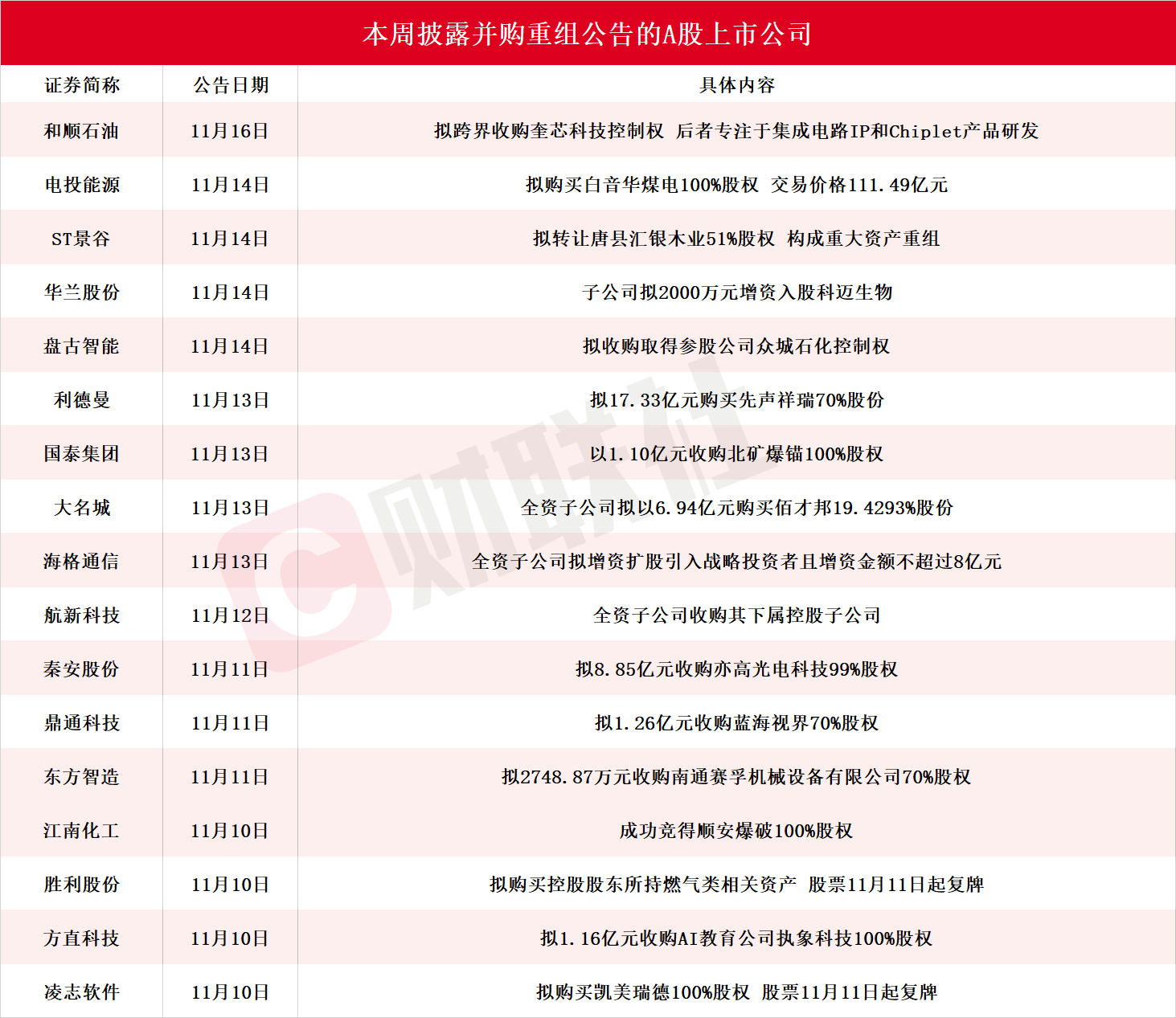 据财联社不完全统计,截至发稿,本周(11月10日-11月16日)包括和顺石油、电投能源、ST景谷、华兰股份、盘古智能、利德曼、国泰集团、大名城、海格通信、航新科技、秦安股份、鼎通科技、东方智造、江南化工、胜利股份、方直科技和凌志软件在内的17家A股上市公司披露并购重组进展最新公告。其中,和顺石油拟跨界收购奎芯科技控制权,后者专注于集成电路IP和Chiplet产品研发。