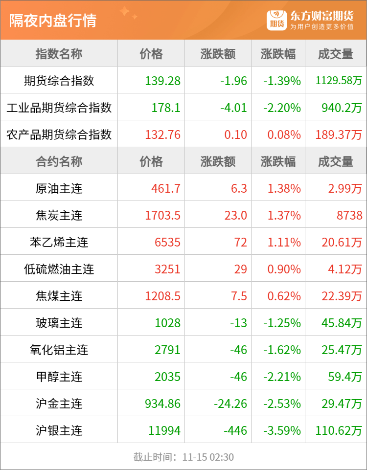 隔夜行情![]() ![]() 每日精选重磅进展!铂、钯期货和期权即将亮相! 美联储官员发表鹰派言论 黄金、白银大跳水 印度突然撤销BIS认证!我国聚酯、PVC出口风向生变? 宏观产经央视网:李强主持召开国务院常务会议,部署增强消费品供需适配性进一步促进消费政策措施。会议指出,增强供需适配性是进一步释放消费潜力、畅通经济循环的有效举措。要以消费升级引领产业升级,以优质供给更好满足多元需求,实现供需更高水平动态平衡。要加快新技术新模式创新应用,强化人工智能融合赋能,聚焦重点行业、重点领域开发新产品和增值服务,持续拓展新的消费增量。要积极支持企业扩大特色、高品质消费品供给,加快安全、性能、绿色等标准更新升级,完善认证体系。要围绕细分市场精准匹配不同人群需求,发展一批柔性制造工厂,推动生产高效响应消费者个性化需要。要培育消费新场景新业态,丰富消费金融产品和服务,营造良好消费环境。 券商中国:美东时间11月14日,美国总统特朗普签署行政令,从美国东部时间11月13日起不再对部分农产品征收所谓“对等关税”。美国白宫表示,此次调整“对等关税”适用范围主要是考虑到美国与贸易伙伴的谈判进展,以及当前美国国内对某些产品的需求和生产能力等因素。 澎湃新闻:为保持银行体系流动性充裕,2025年11月17日,中国人民银行将以固定数量、利率招标、多重价位中标方式开展8000亿元买断式逆回购操作,期限为6个月(182天)。 品种资讯黑色系期货 钢材:247家钢厂高炉开工率82.81%,环比上周减少0.32个百分点,同比去年增加0.73个百分点 ;高炉炼铁产能利用率88.8%,环比上周增加0.99个百分点 ,同比去年增加0.22个百分点;钢厂盈利率38.96%,环比上周减少0.87个百分点,同比去年减少18.62个百分点;日均铁水产量 236.88万吨,环比上周增加2.66万吨,同比去年增加0.94万吨。(Mysteel) 焦炭:11月14日河北市场钢厂对焦炭采购价上调50/55元/吨,调整后:一级湿熄焦(A≤12.5,S≤0.7,CSR≥65,MT≤7),报1760元/吨;一级干熄焦(A≤12.5,S≤0.7,CSR≥65,MT≤0),报2140元/吨(顶装焦);以上均为到厂承兑含税价,15日0时起执行。(Mysteel) 铁矿石:全国47个港口进口铁矿库存总量15812.84万吨,环比增加188.71万吨;日均疏港量340.28万吨,增4.73万吨。全国45个港口进口铁矿库存总量15129.71万吨,环比增加230.88万吨;日均疏港量326.95万吨,增6.02万吨;在港船舶数量116条,增7条。(Mysteel) 农产品期货 豆粕:根据Mysteel农产品对全国动态全样本油厂调查情况显示,第46周(11月8日至11月14日)油厂大豆实际压榨量207.76万吨,开机率为57.15%;较预估低8.03万吨。预计第47周(11月15日至11月21日)国内油厂开机率继续回升。(Mysteel) 棕榈油:11月14日马来西亚棕榈油离岸价为1030美元,较上日持平,进口到岸价为1060美元,较上日持平,进口成本价为9007.52元,较上日跌30.31元,触及一周低点。进口利润为负427.52元/吨,较上日下跌39.69元/吨。(中国粮油商务网) 生猪:据农业农村部监测,2024年10月28日—11月3日,生猪定点屠宰企业生猪平均收购价格为18.71元/公斤,环比下降0.6%,同比上涨16.3%;白条肉平均出厂价格为24.24元/公斤,环比下降0.5%,同比上涨14.7%。 截至11月14日14:00时,全国农产品批发市场猪肉平均价格为18.06元/公斤,比昨天下降0.3%。(农业农村部) 有色/贵金属期货 沪锌:截止2025年11月13日全国主要市场锌锭社会库存为16.07万吨,较11月10日减少0.09万吨。其中上海和天津库存下滑,广东和江苏库存小增。国内消费转弱,采买不足,库存小降,绝对水平保持高位。(Mysteel) 沪铜:截至2025年11月14日,Mysteel统计中国16港进口铜精矿当周库存74.0万吨,较上周增4.8万吨。(Mysteel) 碳酸锂:据Mysteel统计,截至本周(11月14日),28家样本锂矿贸易商锂矿石现货港口+仓库库存15.3万吨,环比上周减少3.2万吨,其中可售库存8.6万吨,环比上周减少1.4万吨。(Mysteel) 能化期货 尿素:山东地区尿素行情弱势运行,小颗粒主流出厂成交1550-1630元/吨,大颗粒出厂成交1800-1830元/吨。临沂市场一手贸易商出货参考价格1600元/吨附近,菏泽市场参考价格1590元/吨附近。(隆众资讯) 对二甲苯:本期二甲苯港口总库存1.94万吨,较上期下降。截至11月13日,二甲苯港口总库存约1.94万吨,较上周期下降0.14万吨。其中华东港口库存在1.78万吨,环比下降0.14万吨;华南港口库存0.16万吨,环比持平。(隆众资讯) 其他期货 欧线集运:截至11月14日,上海出口集装箱运价指数(综合指数)报1451.38点,与上期相比下跌43.72点;中国出口集装箱运价综合指数报1094.03点,与上期相比涨3.4%。(上海航运交易所) 环球视野第一财经:本月以来,有关美联储12月降息概率的走势图上演“过山车”,从一度接近板上钉钉的95%回落到50%上下。美国联邦政府停摆让美联储的经济现状评估陷入困境,在暂时没有更多迹象证明就业市场风险和经济降温的背景下,特朗普政府关税政策背后的通胀隐忧使得货币政策的进一步宽松前景越发不明朗,并已经引发了全球资本市场的动荡。 财联社:美国贸易代表格里尔称,美国计划将瑞士商品关税税率下调至15%,与欧盟类似。他还补充道,瑞士已同意向美国投资2000亿美元。 每日关注无 (文章来源:丁冬财经研究中心) |