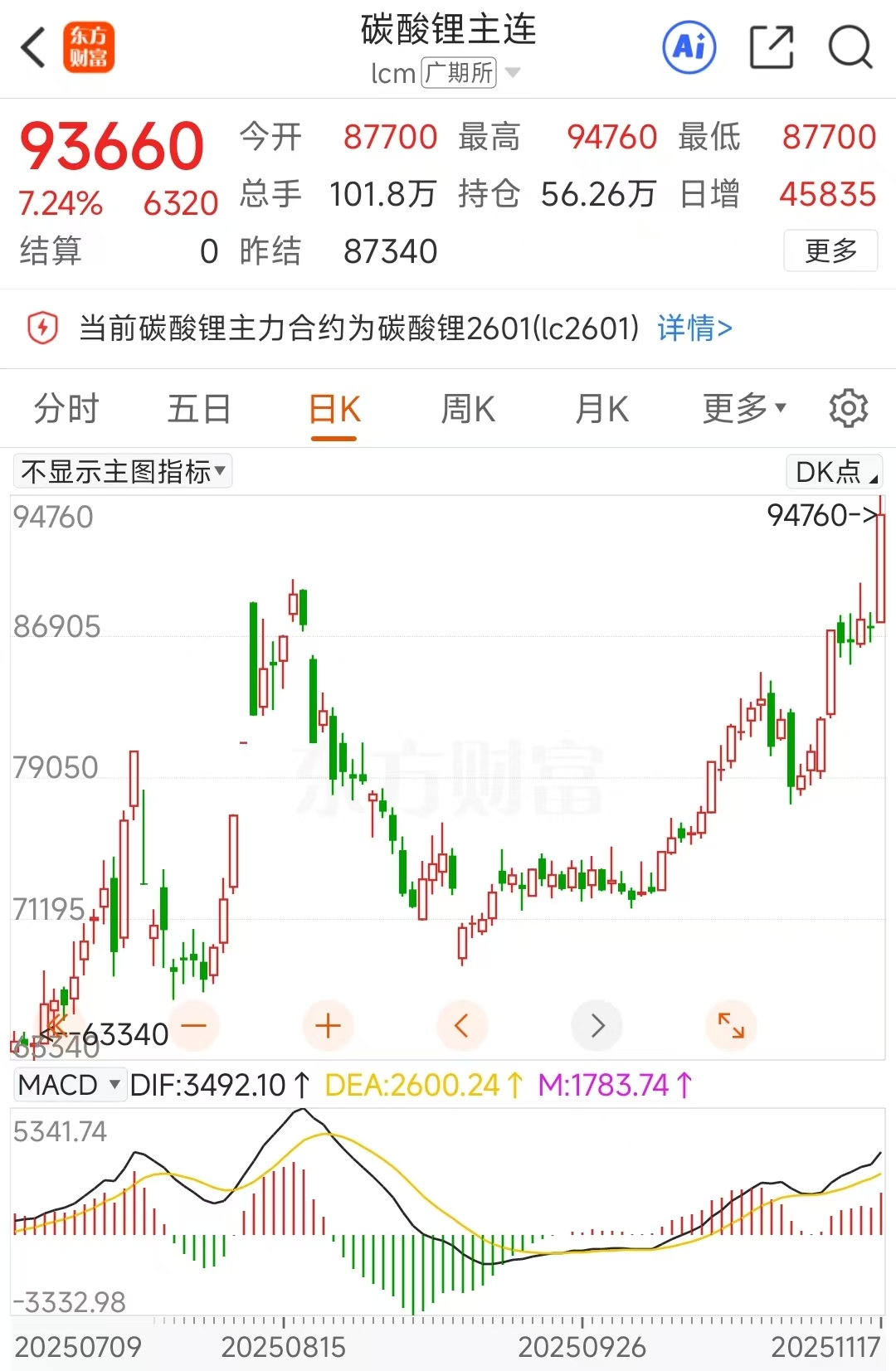 锂矿概念11月17日早盘逆市走强,板块中融捷股份、盛新锂能、大中矿业、国城矿业、金圆股份纷纷涨停。西藏城投、中矿资源、天齐锂业、雅化集团、永兴材料等也大幅上涨。 消息面上,上海钢联发布数据显示,今日电池级碳酸锂(早盘)价格较昨日上涨3600元/吨,中间价报90350元/吨。 一段时间以来,电池级碳酸锂的价格涨势明显。隆众资讯的数据显示,11月14日电池级碳酸锂(Li2CO3≥99.5%)的主流价报86750元/吨,这较9月中旬的71500元/吨,约两个月时间大涨21.33%。 ![]() 在期货市场上,碳酸锂连续主力合约近期也大幅拉升。碳酸锂主连11月17日早盘一度大涨超8%。自9月10日跳空大跌开始,迄今已累计上涨25.99%。 ![]() 赣锋锂业董事长李良彬日前预测,2026年碳酸锂需求会增长30%,需求达到190万吨,同时供应能力经过评估后应该是增长25万吨左右,供需基本平衡,碳酸锂价格有探涨空间。如果明年需求增速超过30%,甚至达到40%,短期内供应无法平衡,价格可能会突破15万元/吨甚至20万元/吨。