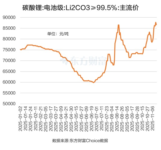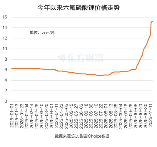 带“锂”的价格都飞涨 事实上,不只是碳酸锂,近期很多带“锂”的电池原材料价格都快速上扬,比如六氟磷酸锂、硫化锂、氢氧化锂、氟化锂、金属锂等产品,其中电解液关键原材料的六氟磷酸锂,更是因为价格短时间翻倍,在资本市场上引起了不小的轰动。 东方财富Choice数据显示,六氟磷酸锂11月14日报价15.15万元/吨,较今年7月中下旬的4.93万元/吨大涨207.3%。 中信证券研报表示,六氟磷酸锂是当前锂离子电池体系中基石级的核心电解质材料,作为电解液的关键溶质,其性能直接决定电池的能量密度、快充能力与安全稳定性。 多氟多近日在接待机构调研中表示,六氟磷酸锂市场供应紧平衡状态可能持续至2026年,价格仍有上涨空间,预计今年年底增速有所放缓,明年整体将呈上行趋势。 ![]() 下游需求激增是主因 综合市场观点来看,锂电池上游原材料的集体涨价,更多在于下游,即动力电池和储能需求的激增。 在新能源汽车领域,据中国汽车动力电池产业创新联盟数据,今年1至10月,国内动力电池装车量为578GWh,同比增长42.4%,已超过2024年全年的548.4GWh;全球而言,据SNE Research数据,今年1月至9月全球电动汽车电池装机量达811.7GWh,同比增长34.7%。 储能增速更为可观,据ICC鑫椤储能数据库统计,2025年1~9月,全球储能电池出货428GWh,同比增长90.7%。 中信建投指出,国内储能全面迎来经济性拐点,投资极为旺盛,主要是新能源市场化+容量电价推动,持续性上认为储能累计渗透率尚不足10%,上调2026年国内新增装机至300GWh。海外最大的机会来自数据中心带来的储能需求,龙头企业已有大量订单。储能将带动锂电需求2026年增速超过30%,对应材料、电池、集成均存在投资机会。该机构同时预测,2026年国内、海外动力电池需求分别同比+16%/20%,全球动力电池需求1559GWh,同比+17%。 融资客最新抢筹股曝光 而这一切,最终都将反馈到源头,即锂矿概念成为了市场追捧的对象。从杠杆资金角度来看,11月以来,宁德时代被融资净买入13.97亿元。天齐锂业紧随其后,被融资净买入3.2亿元。德方纳米、国城矿业、川发龙蟒、东阳光也被融资净买入过亿。 ![]() 国泰海通证券认为,强劲需求支撑,去库预期推动锂价上行。供应方面,锂辉石端和盐湖端均有新产线投产,市场供应稳步增加,锂盐厂开工率维持高位。需求方面,主力下游表现依然强劲,动力电池快速增长、储能市场供需两旺,下游料厂开工率持续走高对现货成交形成支撑。 (文章来源:东方财富研究中心) |