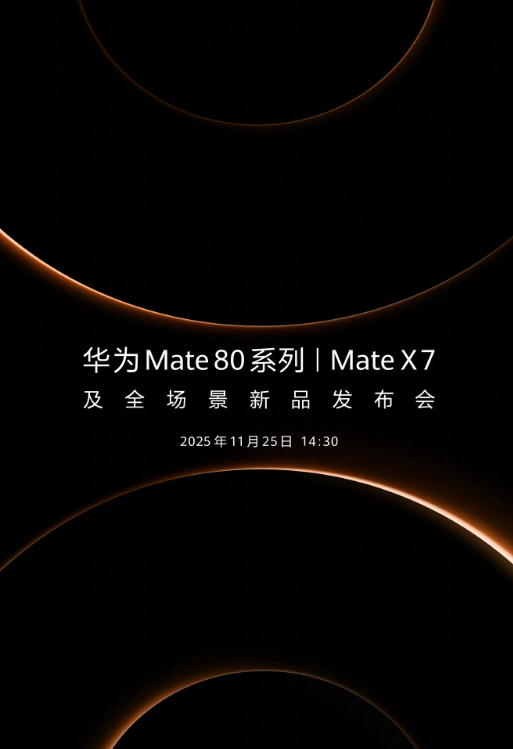 华为常务董事、产品投资委员会主任、终端BG董事长余承东11月17日在微博发布海报并配文“它,来了! ”,宣布华为Mate80系列lMateX7及全场景新品发布会2025年11月25日14:30点举行。 据悉,Mate 80系列依旧包含四款机型:Mate 80、Mate 80 Pro、Mate 80 Pro Max以及Mate 80 RS非凡大师。