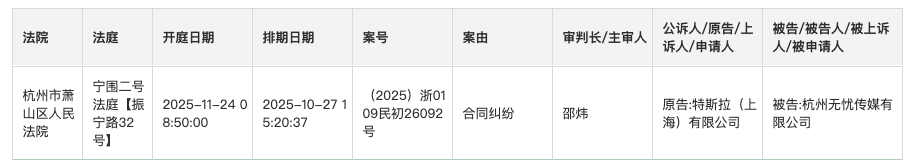 11月17日,浙江法院网显示,特斯拉(上海)有限公司、杭州无忧传媒有限公司新增一则开庭公告,原告为特斯拉(上海)有限公司,案由为合同纠纷,该案将于11月24日在杭州市萧山区人民法院开庭审理。