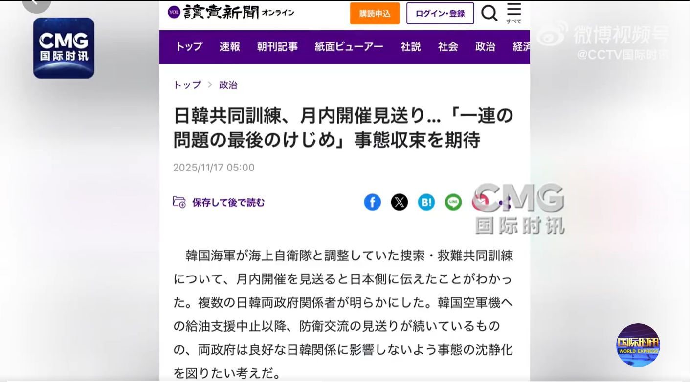今天,外交部例行记者会上,有记者提问:日前,个别日本政客称中方对高市早苗涉台错误言论“反应过度”。日本内阁官房长官也辩称,日本政府在台湾问题上的立场没有改变,与1972年《中日联合声明》一致。中方对此有何回应? 对此,外交部发言人毛宁表示,对于日本首相高市早苗的涉台错误言论,中方已经多次阐明严正立场,有关言论严重违背中日四个政治文件精神,从根本上损害中日关系政治基础。无论日本哪个党派、哪个人执政,都必须坚持和恪守日本政府在台湾问题上的承诺。我们敦促日方本着对历史和双边关系负责的态度,停止越线玩火,收回错误言行,切实把对华承诺体现在实际行动上。 相关报道日本自民党政要透露:高市早苗正在反省 今后应该不会有类似发言 据参考消息,外媒报道,当地时间11月16日,自民党代理政调会长田村宪久在富士电视台节目中透露,高市早苗正在反省其涉台言论。田村宪久表示:“首相也在反省没有充分说明背景之处,今后应该不会有此类发言。” ![]() 图片来源:视频截图 据CCTV国际时讯,外媒报道称,韩国海军已向日本海上自卫队转达了“将暂停原定于本月内举行的联合搜救演习”的意向。日本防卫省官员对此表示,“韩国海军将与日本海上自卫队就此次联合演习的时间进行调整”。 ![]() 图片来源:央视新闻 据日本政府相关人士透露,韩日这一联合搜救演习1999年至2017年先后进行过10次。2018年12月发生的“日本巡逻机抵近韩海军舰艇飞行后被韩方火控雷达锁定”一事,在两国间引发矛盾,联合演习中断。因此各界曾将韩日此次重启这一演习看作是双方“加强合作的象征”。 此前,日本方面曾考虑向参加迪拜航展的韩国空军特技飞行队“黑鹰”提供加油支援,但后来日方又以部分“黑鹰”飞行队飞机曾在韩日争议岛屿“独岛”(日本称“竹岛”)附近上空参加例行训练为由,拒绝为“黑鹰”提供加油支援,导致“黑鹰”飞行队无法参加迪拜航展。 韩国军方则在日方拒绝为“黑鹰”飞行队提供加油支援后,取消了韩国军乐队本月13日至15日在东京参加“日本自卫队音乐节”的计划。 据央视新闻消息,韩国总统府16日宣布,韩国政府将东北亚三国称谓顺序统一为“韩中日”,即韩国、中国、日本。 总统府解释称,此次统一根据韩语使用习惯作出,“韩中日”的顺序为韩国社会更多的人所更经常采用。 韩国前总统尹锡悦执政时期,韩国政府曾表示,出于强调韩日合作等目的,将韩语中惯常使用的“韩中日”表述改为“韩日中”。 韩联社评论说,在李在明政府谋求对华关系改善的背景下,此举可谓是间接对华示好的举措之一。 一名现任总统室官员也确认了这一说法,该官员称,尹锡悦政府过度偏向日本,破坏了外交平衡原则,如今拨乱反正才是正确的做法。 11月1日,韩国总统李在明在亚太经合组织领导人非正式会议结束后举行记者会,介绍会议成果。在回答中央广播电视总台记者提问时,李在明表示,中韩经济合作至关重要。 李在明说,中韩两国地理上毗邻,经济上深度依存,中韩经济合作至关重要。中韩两国政府都致力于让人民生活得更好、建设更有希望的国家。 李在明还表示,将积极创造机会促进中韩对话交流与合作,共同打造东北亚和平稳定。他说,韩方将致力于在多个方面加强与中国的合作,特别是在经济、民间交流领域,并将进一步探讨如何在维护东北亚和平与稳定方面发挥作用,创造更多沟通与合作的契机。 (文章来源:央视新闻) |