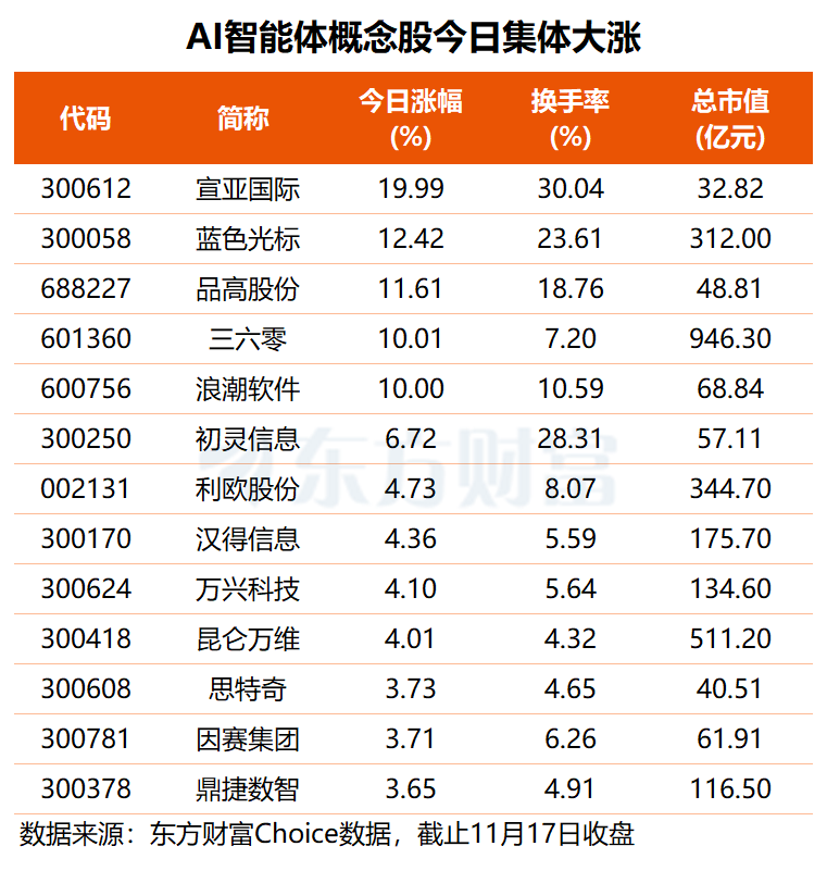 A股三大股指午后低位横盘震荡,截至收盘,沪指跌0.46%,深成指跌0.11%,创业板指跌0.20%。 量能方面,两市全天成交1.91万亿元,较昨日缩量约473亿元。逾2700股今日下跌,2584股飘红。此外,共计100股涨停,封板率超76%。 板块方面,锂矿概念、AI应用、国防军工等涨幅居前,有机硅板块午后异动,CPO概念尾盘拉升;医药、培育钻石、保险、黄金概念等领跌。 近期资金在主题投资及景气成长方向较为活跃,中信建投认为,后续市场或继续维持震荡轮动状态。中期配置方面,可采取攻守兼备的策略,围绕明确景气线索进攻,勿过度频繁切换。重点关注板块包括:红利、化工新材料、超硬材料、锂电材料、钢铁、农林牧渔、电池、AI等。 中泰证券指出,展望后市,价格端的边际改善与宏观政策环境的宽松预期或将共同推动A股进入“震荡向上、结构主导”的阶段。当前市场无需悲观,建议继续保持偏积极的仓位结构,但也不宜盲目追高指数。在4000点上方震荡格局未被突破前,最优策略仍是围绕“反内卷+AI应用”的双主线进行结构化配置,通过景气趋势、政策方向及资金流的三重共识获取超额收益。 ![]() 有机硅板块午后飙涨 早盘一度大跌1.4%的有机硅板块午后异动拉升,截至收盘,概念板块指数涨1.64%。其中,晨光新材封板,富祥药业一度20cm涨停,东岳硅材涨近10%,晨化股份、天赐材料、合盛硅业等均有明显异动。 消息面上,据媒体报道,针对11月12日有机硅行业开会协商减产的传闻,东岳硅材、兴发集团的工作人员均回应“确有其事”。此外,当天会议仅为碰头会,11月18日将召开有机硅行业实控人会议,或将确定减产目标。行情数据显示,目前多数有机硅厂商处于停报封盘状态。 据百川盈孚,2019-2024年我国有机硅中间体名义产能从152万吨扩张至344万吨,CAGR为17.8%,展望后市已无大规模新增产能释放,扩产周期步入尾声。海外方面,因欧美生产成本偏高及发展定位转变等因素,过去五年中已有合计超30万吨/年产能宣布退出,内外供给端压力均有所缓解。 国投证券指出,若行业减产30%的计划得到落实,或将每月影响近9万吨供应量,有望充分激发价格弹性。在需求端,伴随新能源、电子电器、半导体等领域需求同步崛起,有机硅应用领域有望加速向价值链高端延伸,打开新增长点。 开源证券指出,若联合减产落地,有机硅供需有望得到边际改善,产业链有望迎来景气上行周期。申银万国证券也认为,供给端,我国有机硅DMC产能达峰,海外产能存退出预期;需求端,地产边际影响放缓,光伏及新能源汽车需求仍强劲,带动国内表观消费量或维持双位数增长。我国有机硅DMC行业开工率将由2024年的67%逐步提升至2026年的83%,叠加“反内卷”或催化成本端支撑强劲,行业有望迎来底部反转。 ![]() AI应用概念股表现活跃 AI应用板块全天维持强势,宣亚国际20cm涨停,三六零、华胜天成、浪潮软件等封板,盛视科技尾盘直线拉升涨停,东方国信、品高股份、蓝色光标涨超10%,拓维信息、南威软件、软通动力等多股跟涨。 消息面上,阿里巴巴正式宣布“千问”项目,全力进军AI to C市场。目前,千问APP公测版已在各大应用商店上架,并同步提供网页和PC版。面向全球市场的千问APP国际版也将在近期上线。据悉,千问App不仅能与用户“对话”,更能为用户“办事”,打造未来的AI生活入口,将陆续覆盖办公、地图、健康、购物等多个生活场景。 国海证券指出,此次阿里AI应用布局向C端市场的倾斜,意味着未来一到两年内,千问APP有望被打造成新的高频超级入口,并与阿里电商、文娱、本地生活深度协同。考虑到阿里积累的深厚用户基本盘与大规模AI基建规划,国海证券认为,相关AI应用及算力产业链将持续受益。 另据媒体报道,华为将在11月21日发布AI领域的突破性技术,该技术通过软件创新实现英伟达、昇腾及其他三方算力的统一资源管理与利用,屏蔽算力硬件差异,为AI训练推理提供更高效的资源支撑。 此外,包括腾讯、字节跳动、百度等国内互联网大厂也在加速AI领域布局。 腾讯董事会主席兼首席执行官马化腾近日表示,腾讯对AI的战略投入,不仅为公司在广告精准定向及游戏用户参与度等业务领域带来助益,也带来了编程、游戏及视频制作等环节的效率提升。随着混元能力不断提升,腾讯在推动元宝普及的投入以及在微信内发展AI智能体能力所作的努力,将带来更积极的进展。 百度创始人李彦宏近日在百度世界大会上指出,AI正跨越从“智能涌现”到“效果涌现”的临界点,当AI能力内化为原生能力时,将成为驱动企业发展和个人成长的核心生产力。百度会持续投入、研发更前沿的模型,推高智能天花板。 中信证券表示,中长期维度,AI将在广告营销、内容创造、搜索等多个方面重塑互联网大厂的主要业务,头部互联网厂商有望通过AI化契机进一步加深自身业务护城河,并在多个方向探索货币化的机会。 东吴证券认为,目前泛AI方向中,有较多细分由于短期催化有限、多头叙事累积不足而处于相对低位,后续一旦有超预期产业事件如技术新突破、出圈新单品等出现,累积多头叙事、凝聚资金共识,则相关方向赔率可观。可以关注AI+医药、AI端侧、人形机器人、智能驾驶、AI应用与Agent等分支。 ![]()