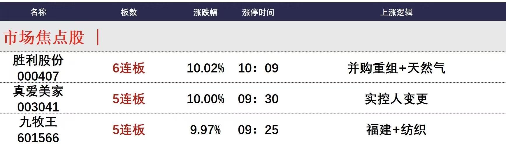 今日午盘全市场共38股涨停,连板股总数15只,26股封板未遂,封板率为59%(不含ST股、退市股)。焦点股方面,并购重组的胜利股份6连板,实控人变更的真爱美家5连板,福建本地股九牧王5连板。