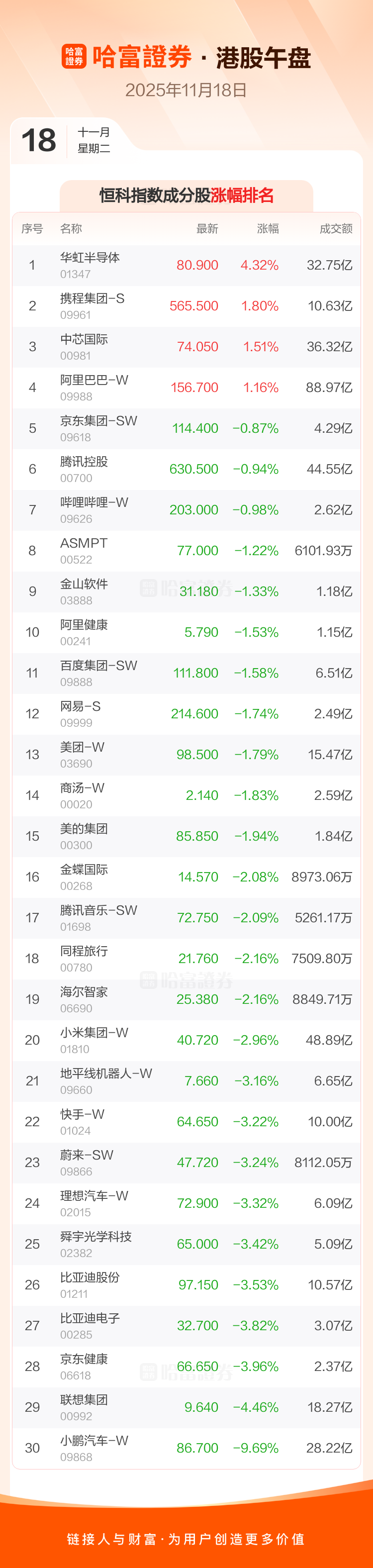 港股11月18日午盘走低 ,恒生指数收报25997.2点,跌387.08点,跌幅1.47%;恒生科技指数收报5660.83点,跌96.05点,跌幅1.67%。恒生指数成分股中携程集团-S、中芯国际、阿里巴巴-W涨幅居前,中国宏桥、联想集团、中升控股跌幅靠前。恒生科技指数成分股中华虹半导体、携程集团-S、中芯国际涨幅居前,小鹏汽车-W、联想集团、京东健康跌幅靠前。