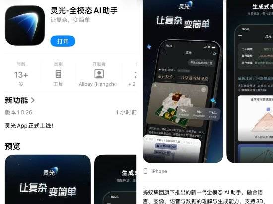 丁冬科技讯 11月18日上午消息,今日,蚂蚁集团正式发布全模态通用AI助手“灵光”,开创性地在移动端实现“自然语言30秒生成小应用”,并且可编辑可交互可分享。灵光也是业内首个全代码生成多模态内容的AI助手,首批上线三大功能:“灵光对话”、“灵光闪应用”、“灵光开眼”,支持3D、音视频、图表、动画、地图等全模态信息输出,对话更生动,交流更高效。目前,灵光已同步登陆安卓与苹果应用商店。 据悉,“灵光对话”突破传统文字问答模式,不是堆砌文字,而是像策展一样设计每次对话:通过结构化思维,让AI回答逻辑清晰、表达简练;通过生成可视化内容,如动态3D模型、可交互地图、音视频等,让内容呈现更生动;最终以优质的信息组织方式,让用户“秒懂”知识。 值得一提的是,灵光开创性地面向普通用户推出了“闪应用”功能。用户在对话中说出或输入一句话,灵光1分钟以内、最快30秒就能生成一款AI应用。(罗宁)