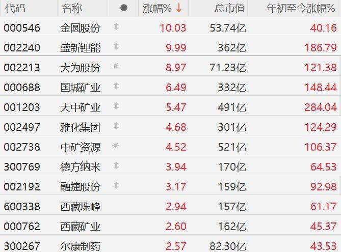 格隆汇11月18日|A股市场锂矿股继续上涨,其中,金圆股份(000546)、盛新锂能涨停,大为股份涨近9%,国城矿业(000688)涨超6%,大中矿业涨超5%,雅化集团(002497)、中矿资源(002738)涨超4%。消息面上,碳酸锂期货主力合约涨超4%,现报96560元/吨。
