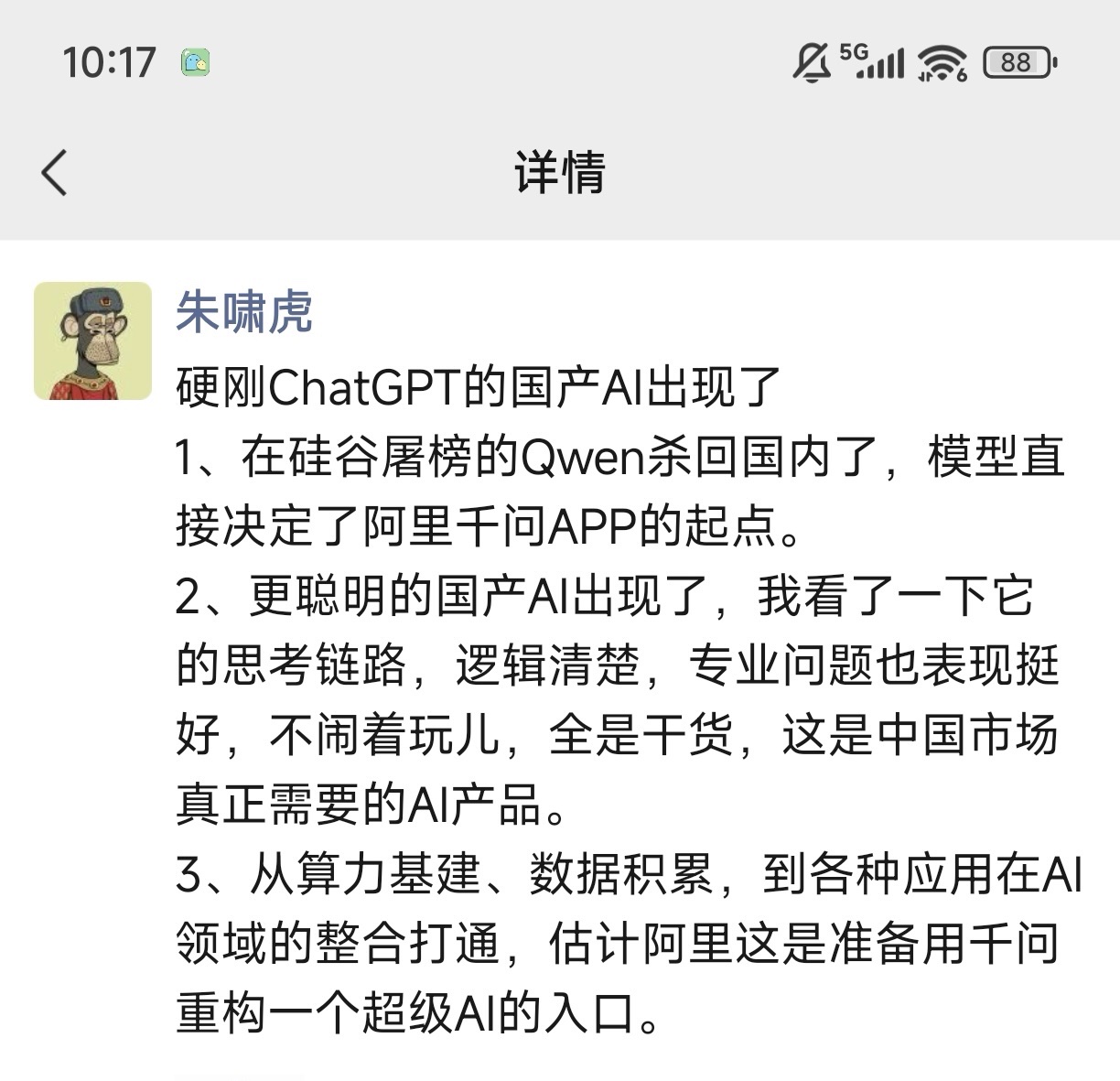 专业金融数据,下一代智能终端 11月17日,阿里巴巴千问App公测版上线,全面对标ChatGPT。记者注意到,当天推出后,社交平台涌现出大量用千问App咨询投资决策的发帖,也出现不少“千问概念股”总结帖。 总体看,这些帖子紧跟市场情绪。比如关于黄金的买点、科技板块与价值板块的选择,“易中天”的调仓等现阶段投资热点问题。而对于这些问题,千问都能给出详细、专业的解答。 千问的投资能力持续被市场关注,源于其在海外投资大赛上的惊艳表现。在10月份美国人工智能研究机构Nof1.ai发起的全球AI投资大赛上,阿里千问以超20%的盈利率,力压Chat GPT-5、Gemini 2.5 Pro、Claude Sonnet 4.5、Grok 4等全球顶尖大模型夺冠,DeepSeek位列第二,中国两大模型成为仅有的保持盈利的大模型。硅谷其他大模型全部亏损,其中Chat GPT-5亏损超60%垫底。 记者就千问的投资能力进行问询。千问方面回应:“上线后有大量用户咨询投资问题,也有询问炒股跟单服务的。目前,团队确实在金融投资领域做了不少优化,可以当投资助理,但不能当操盘手,目前无法提供直接炒股跟单服务。而且投资环境不同,不能简单照搬,注意投资风险。” ![]() 昨日,千问App公测上线后,著名投资人金沙江创投朱啸虎在朋友圈中表示,“硬刚ChatGPT的国产AI出现了。在硅谷屠榜的Qwen杀回国内,模型直接决定了阿里千问App的起点;更聪明的国产AI出现了,我看了一下它的思考链路,逻辑清楚,专业问题也表现挺好,不闹着玩儿,全是干货,这是中国市场真正需要的AI产品;从算力基建、数据积累,到各种应用,在AI领域的整合打通,估计阿里这是准备用千问重构一个超级AI入口。” ![]() 值得注意的是,阿里巴巴推出千问App的当日就遭遇流量洪峰。因用户涌入过载,部分服务出现拥堵和中断。据多名用户反馈,进行投资咨询时,出现响应缓慢甚至“网络异常,请稍后重试”。随后千问回应,已经紧急扩容,保障用户使用。 (文章来源:上海证券报·中国证券网) |