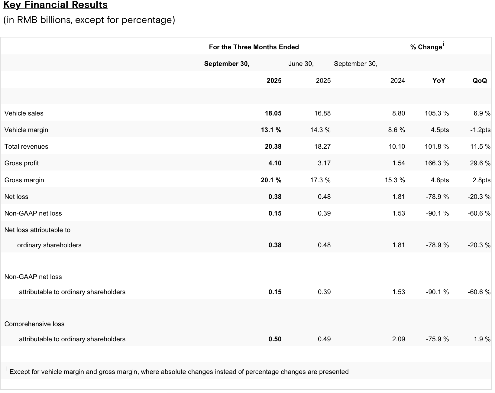 今年第三季度,小鹏汽车的销量、收入、毛利率等数据再创新高。 11月17日,小鹏汽车(09868.HK;XPEV.US)披露2025年第三季度财报。财报显示,公司第三季度实现营收203.8亿元,同比增长101.8%,环比增长11.5%;归母净亏损为3.8亿元,同比收窄78.9%,环比收窄20.3%。 毛利率同样创下历史新高。小鹏汽车2025年第三季度综合毛利率达到了20.1%,同比增长4.8个百分点。其中,汽车毛利率为13.1%,较2024年同期增长4.5个百分点,环比下降1.2个百分点。 对于毛利率的大幅增长,小鹏汽车副董事长及联席总裁顾宏地表示,主要因有效的成本控制和技术研发相关的收入释放出更大的潜力,期待与更多全球商业和技术合作伙伴一起扩大物理AI应用的生态,形成技术研发与商业化相互促进的正循环。 现金储备上,截至2025年9月30日,小鹏汽车的现金及现金等价物、受限制现金、短期投资及定期存款为人民币483.3亿元,较2025年6月30日增加约7.6亿元,现金储备创历史新高。 ![]() 展望第四季度,小鹏汽车预期汽车交付量为12.5万辆至13.2万辆,同比增长36.6%至44.3%;总收入为215亿元至230亿元,同比增加33.5%至42.8%。