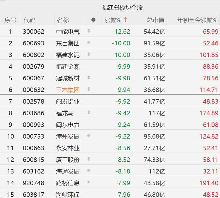 格隆汇11月18日|A股市场福建板块全线下挫,其中,中能电气(300062)跌超12%,东百集团(600693)、福建水泥(600802)、福建金森(002679)、冠城新材、三木集团(000632)10CM跌停,闽发铝业(002578)、福龙马、闽东电力(000993)、漳州发展(000753)逼近跌停,永安林业(000663)、厦工股份、海通发展跌超8%,路桥信息、海峡环保(603817)跌超7%。