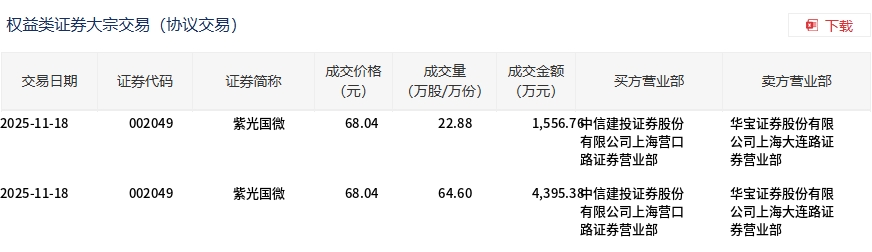11月18日,紫光国微大宗交易成交87.48万股,成交额5952.14万元,占当日总成交额的4.47%,成交价68.04元,较市场收盘价76.23元折价10.74%。