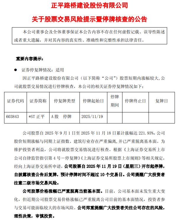 11月18日,*ST正平(603843.SH)公告称,公司股票自2025年9月1日至11月18日累计涨幅达221.93%,股价短期涨幅与同期上证指数、建筑行业存在严重偏离,已严重脱离基本面。公司股票自2025年11月19日(星期三)开市起停牌核查,自披露核查公告后复牌,预计停牌时间不超过10个交易日。