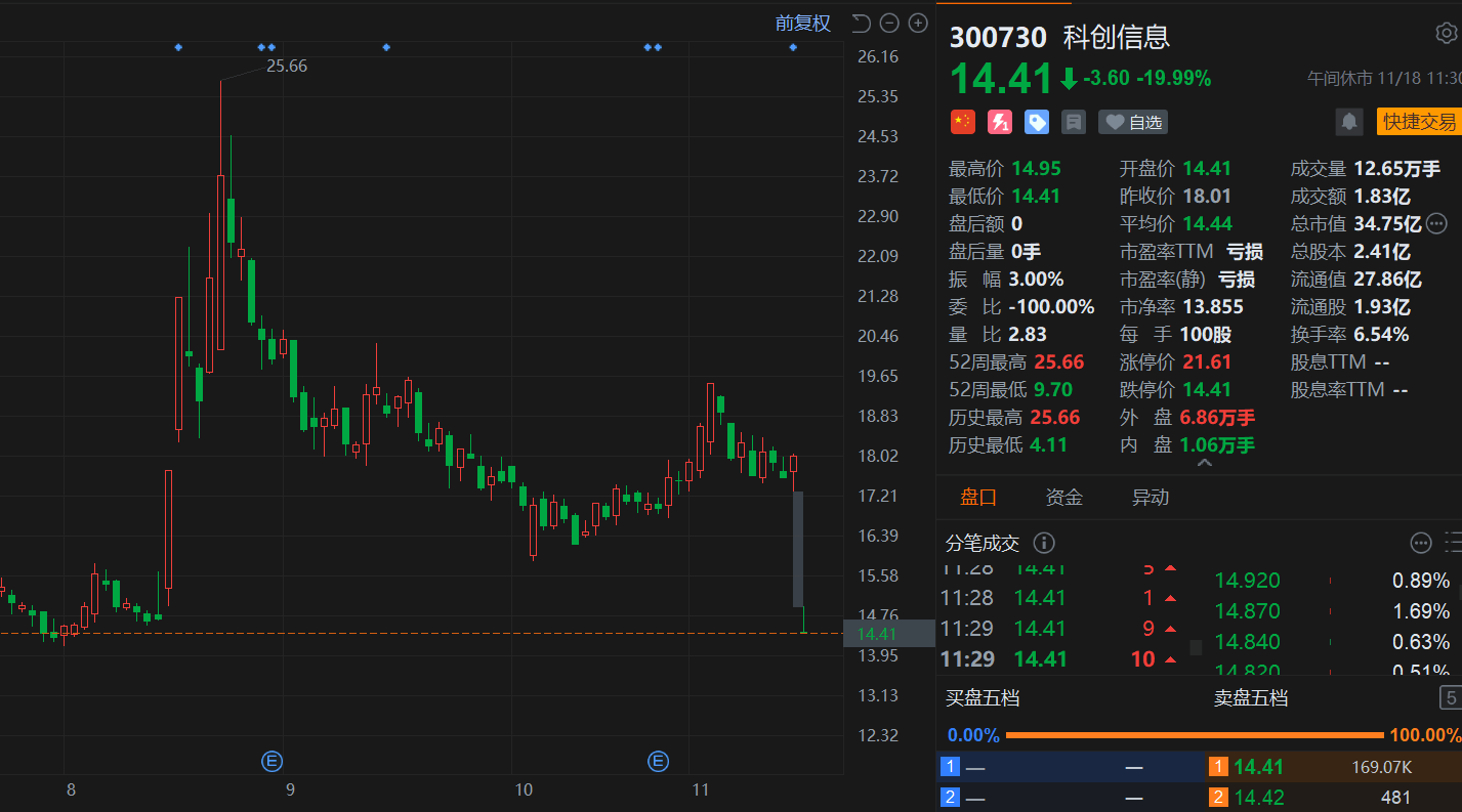 格隆汇11月18日|科创信息(300730)(300730.SZ)跌停,报14.41元创今年8月初以来新低,总市值不足35亿元。消息上,科创信息于2025年11月17日收到中国证监会下发的《立案告知书》,因公司涉嫌信息披露违法违规,中国证监会决定对公司立案。虽然公司已被立案,但在公告中,科创信息并没有透露公司被立案的具体缘由,仅表示,目前公司各项经营活动和业务均正常开展。值得注意的是,根据科创信息此前发布的公告,公司曾遭遇上亿元合同诈骗。