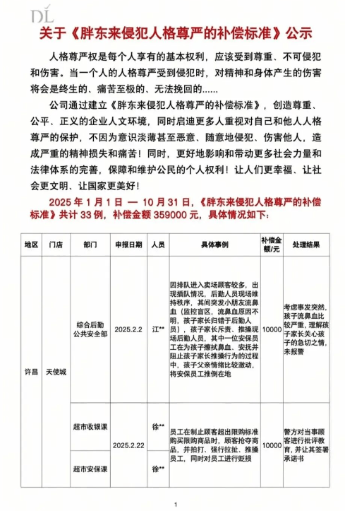 11月17日,胖东来发布《胖东来侵犯人格尊严的补偿标准》,列举了2025年1月1日―10月31日33例员工被侵犯人格尊严的案例,补偿金额359000元。 案例显示,这些员工大多是在工作当中被顾客掌掴、辱骂、推搡,其中补偿最多达50000元,最少的为3000元。 胖东来表示,人格尊严权是每个人享有的基本权利,应该受到尊重、不可侵犯和伤害。当一个人的人格尊严受到侵犯时,对精神和身体产生的伤害将会是终生的、痛苦至极的、无法挽回的。 公司通过建立《胖东来侵犯人格尊严的补偿标准》,创造尊重、公平、正义的企业人文环境,同时启迪更多人重视对自己和他人人格尊严的保护,不因为意识淡薄甚至恶意、随意地侵犯、伤害他人,造成严重的精神损失和痛苦!同时,更好地影响和带动更多社会力量和法律体系的完善,保障和维护公民的个人权利!让人们更幸福、让社会更文明、让国家更美好!