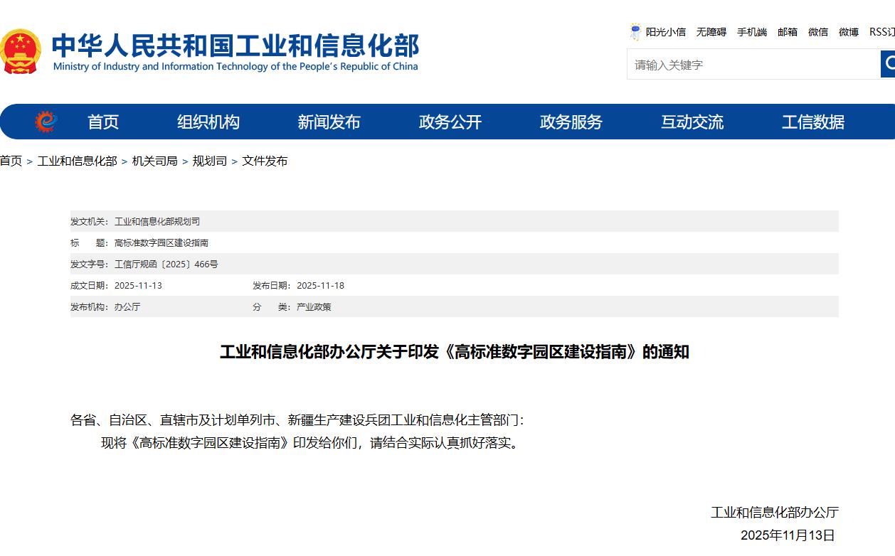 11月18日,工业和信息化部办公厅印发《高标准数字园区建设指南》。指南提出,锚定实现新型工业化这个关键任务,以数字技术与园区发展深度融合为主线,以园区产业数字化转型为重点,协同推进园区服务数字化、管理数字化,夯实数字基础设施,提升园区发展质量,为加快推进新型工业化、建设现代化产业体系提供有力支撑。到2027年,建成200个左右高标准数字园区,实现园区规上工业企业数字化改造全覆盖,园区管理、服务数字化水平明显提升,形成一批可复制可推广的数智赋能园区发展的典型模式,园区发展质量和效益显著提升。 高标准数字园区建设期满后应达到以下标准: ——产业数字化水平高。工业互联网应用覆盖园区全部行业,规上工业企业数字化改造覆盖率达100%。 ——专业服务品质高。在生产、生活、政务等方面提供高质量的数字化公共服务,园区数字化生产性服务应用覆盖规上工业企业比例达100%。 ——运营管理效率高。建成覆盖园区资产管理、经济运行监测、绿色低碳发展、安全应急管控等主要环节的数字化运营管理系统,园区运营管理效率显著提升。 ——基础设施能级高。数字基础设施支撑作用显著增强,双千兆网络覆盖率达100%,算力基础设施实现有效部署和应用,数据开放共享、安全保障水平显著提升。 ![]()