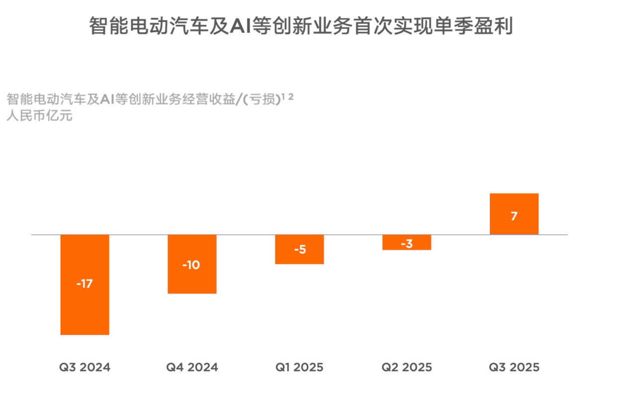 图片来源:时代周报记者摄 11月18日盘后,小米集团(01810.HK)公布2025年三季度业绩报告,其当季营收1131.2亿元,同比增长22.3%;净利润为113.1亿元,同比增长80.9%。 小米智能电动汽车和AI等创新业务(下称创新业务)是集团内部增速最快的业务板块,相较于去年同期大幅增长。今年第三季度这一业务营收达到290亿元,同比增长199.2%;净利润7亿元,首次实现季度盈利。 作为创新业务的主要组成部分,小米智能电动汽车业务(下称汽车业务)当季营收283亿元。在三季度,小米汽车合计汽车销量108796辆,较去年同期大幅增长173.4%。尤其在工厂扩充产能后,小米汽车单月销量已逼近5万辆。 这让小米汽车成为了最快盈利的新势力品牌。在今年上半年,小米集团创始人、董事长兼CEO雷军称小米汽车业务将在今年三季度或四季度盈利,目前小米汽车已提前完成这一目标。 比小鹏、蔚来更快盈利 今年三季度,尽管先是被要求召回116887辆小米SU7标准版,后陷入成都小米SU7 ULTRA撞上护栏起火事件,但小米汽车依旧屡破单月销量纪录。 据懂车帝数据,7-9月,小米分别售出30452辆、36396辆、41948辆汽车,单季销量达到108796辆。今年前三个季度,小米累计售出266722辆汽车,几乎两倍于去年全年销量。在2024年,小米累计售出136854辆汽车。 与此同时,小米汽车均价由去年三季度的238650元提升至今年三季度的260053元。三季度销量和均价齐升,把小米创新业务的营收推升至290亿元,其中小米汽车业务营收283亿元,汽车相关服务贡献了约7亿元营收。 小米创新业务还首次实现单季盈利,三季度净利润7亿元。