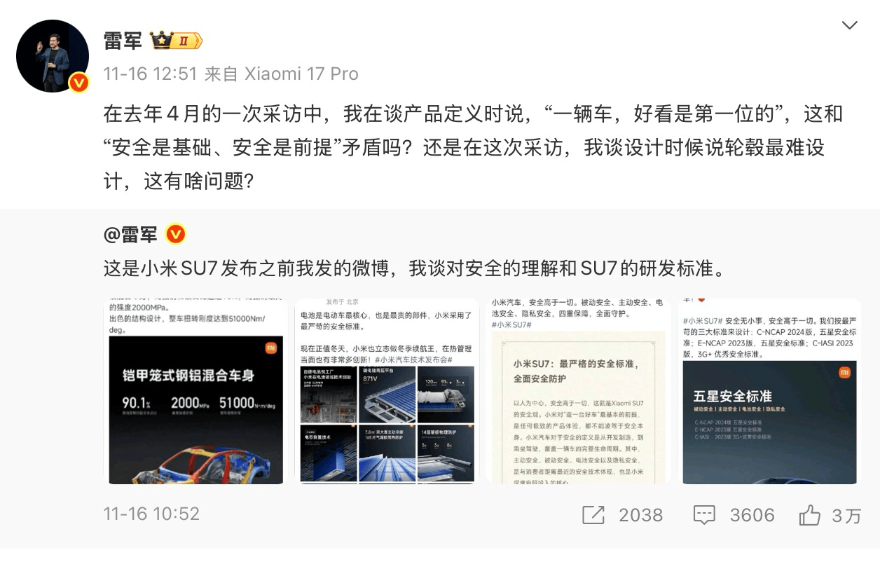 截图自雷军微博 值得一提的是,当下小米汽车和雷军所处的舆论环境与小米SU7、YU7上市时大相径庭。尤其是在近期,雷军和小米陷入了“如何取舍车辆安全与美观”的争议之中。此前在今年3月和10月,小米汽车在安徽省、四川省等地发生的多起事故引发关注。 在11月16日,雷军就汽车的安全与美观连发多条微博,称“车辆好看”与“安全是基础”并不矛盾,疑似回应小米汽车更注重美观、其次才是安全的质疑。 在业内人士看来,小米后续新车能否再获现象级订单或受多个因素影响,包括产品质量、售价以及舆论环境等。尤其是近期电动汽车安全事故频发,市场的耐心备受考验。 (责任编辑:张晓波 )
