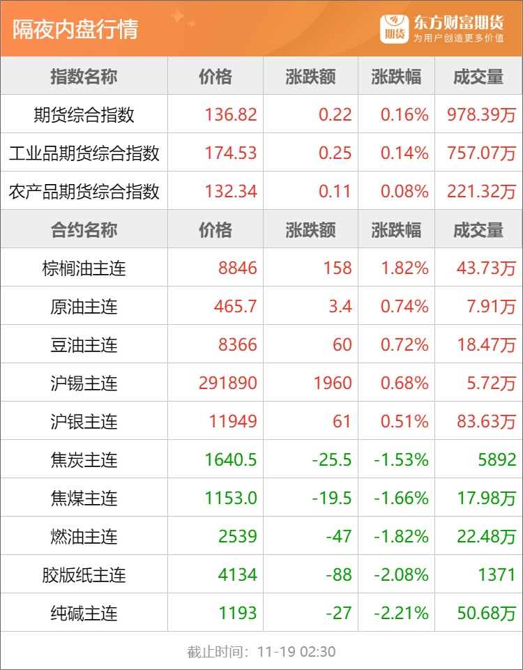 隔夜行情![]() ![]() 每日精选特朗普:已确定下一任美联储主席人选 11月碳酸锂维持多头窗口 但须警惕冲高后资金离场风险 反内卷还是反垄断?通威掌门人刘汉元首次回应多晶硅收储进展 宏观产经澎湃新闻:近期,中方密集批驳日本首相高市早苗涉台错误言论。在今天的外交部例行记者会上,发言人毛宁表示,中日关系出现目前的局面,根源在于日本首相高市早苗公然发表涉台错误言论,粗暴干涉中国内政,严重违背一个中国原则和中日四个政治文件的精神,破坏中日关系政治基础。中方维护核心利益、捍卫国际正义的立场没有丝毫改变。日方必须立即收回错误言论,深刻反省,改弦更张,给中国人民一个明确的交代。 央行北京分行:中国人民银行北京市分行等12部门印发《金融支持北京市提振和扩大消费的实施方案》。其中提出,加大债券市场融资支持力度。支持符合条件的文化、旅游、教育等服务消费领域企业发行债券。鼓励符合条件的科创企业通过债券市场募集资金,推动智慧养老、智能医疗等消费产品提质升级。支持辖内符合条件的消费金融公司、汽车金融公司、金融租赁公司发行金融债券,拓宽资金来源,扩大消费信贷规模。推动个人汽车、消费、信用卡等零售类贷款资产证券化增量扩面,促进盘活信贷存量,提升消费信贷供给能力。 央视新闻:美国商务部专利商标局近期发布备忘录,修改专利无效申请的透明度规则,重点审查有外国背景企业提出的申请。据悉,个别中国企业已收到美方通知,要求其陈述适用专利无效申请的理由。商务部发言人表示,中方认为美方做法违反其知识产权相关国际义务,是对中国企业合法权利的歧视性限制。中方将密切关注事态发展,并采取必要措施,坚决维护中国企业正当合法权益。 品种资讯黑色系期货 铁矿石:截至11月17日,中国47港进口铁矿石港口库存总量15799.45万吨,较上周一降20.04万吨;45港库存总量15114.45万吨,环比降13.74万吨。 11月10日-11月16日,澳大利亚、巴西七个主要港口铁矿石库存总量1285.3万吨,环比增加22.7万吨,呈持续累库趋势,当前库存水平处于四季度以来的最高点。(我的钢铁网) 焦煤:11月18日蒙古国进口炼焦煤市场偏弱运行。口岸贸易企业报价下调,部分下游企业低价采购,蒙古国线上电子竞拍参与积极性减弱,成交价格下降,且有部分煤种流拍,甘其毛都口岸通关保持高位运行,监管区库存有继续累库预期,国内部分产地炼焦煤价格下降,后续炼焦煤价格走势有待观望。(我的钢铁网) 锰硅:欧盟周二宣布对含锰或含硅的钢铁合金实施进口配额,以保护本土生产商免受廉价进口激增的冲击。(新华财经) 农产品期货 生猪:据国家级生猪大数据中心18日发布,监测显示,2025年11月18日,31个省(自治区、直辖市)外三元生猪价格1涨10跌20平,呈稳中下跌趋势。(新华财经) 棉花:洲际交易所(ICE)公布数据显示,截至11月17日,ICE可交割的2号期棉合约库存升至20344包,前一日为19244包。(新华财经) 棕榈油:全球最大的棕榈油生产商之一的马来西亚SD Guthrie公司周二(18日)表示,虽然季风季到来引发了人们对未来两个月马来西亚棕榈油生产可能中断的担忧,但天气模式并没有影响棕榈果串收割作业。(新华财经) 上周棕榈油到港增加而需求端跟进不足,导致库存再度累积。中国粮油商务网监测数据显示,截止到2025年第46周末,国内棕榈油库存总量为57.4万吨,较上周的55.2万吨增加2.2万吨;合同量为4.3万吨,较上周的4.2万吨增加0.1万吨。(中国粮油商务网) 豆粕:上周国内油厂大豆压榨量再度回升至200万吨以上高位,但下游饲料企业采购策略基本不变,维持现有豆粕头寸采购现货补库滚动,豆粕库存随之攀升。中国粮油商务网监测数据显示,截止到2025年第46周末,国内豆粕库存量为99.9万吨,较上周的96.9万吨增加3.0万吨,环比增加3.05%;合同量为587.1万吨,较上周的653.8万吨减少66.7万吨,环比下降10.21%。(中国粮油商务网) 有色/贵金属期货 铸造铝:据外媒报道,欧盟贸易专员塞夫科维奇周二(11月18日)表示,欧盟委员会计划限制欧盟的废铝出口,以防范供应危机。据欧洲铝业协会称,欧盟废铝出口量在2024年达到创纪录的126万吨,较五年前高出约50%,其中大部分出口到亚洲。(新华财经) 沪铜:德商银行预计明年铜价和铝价将继续上涨,分别达到12000美元/吨和3200美元/吨。(财联社) 碳酸锂:据Mysteel数据显示,11月18日MMLC电池级碳酸锂(早盘)价格较昨日上涨4100元/吨,中间价报94450元/吨。(Mysteel) 多晶硅:海关总署11月18日公布的数据显示,中国10月多晶硅进口量为1446吨,同比减少39.1%。1-10月累计进口量为16123吨,同比减少52.3%。(海关总署) 能化期货 玻璃:进入11月,各大区深加工样本持有订单均值环比月初均有下滑,订单疲软态势也导致部分加工厂出现阶段性放假现象,目前调研的深加工所持订单天数较少在2-5天居多,另有排期集中在7-15天,亦有少数工程订单排期较长,临近年末,欠款类订单深加工签单依旧保持谨慎心态。截至11月17日,全国深加工样本企业订单天数均值9.9天,环比下降8.9%,同比减少24.2%。(隆众资讯) 乙二醇:海关总署11月18日公布的数据显示,中国2025年10月乙二醇进口量为65万吨,同比增加31.2%。1-10月乙二醇累计进口量为630万吨,同比增长16.2%。(海关总署) 环球视野财联社:ADP周度就业报告显示,截至2025年11月1日的四周里,私人部门雇主平均每周减少2500个就业岗位。 第一财经: