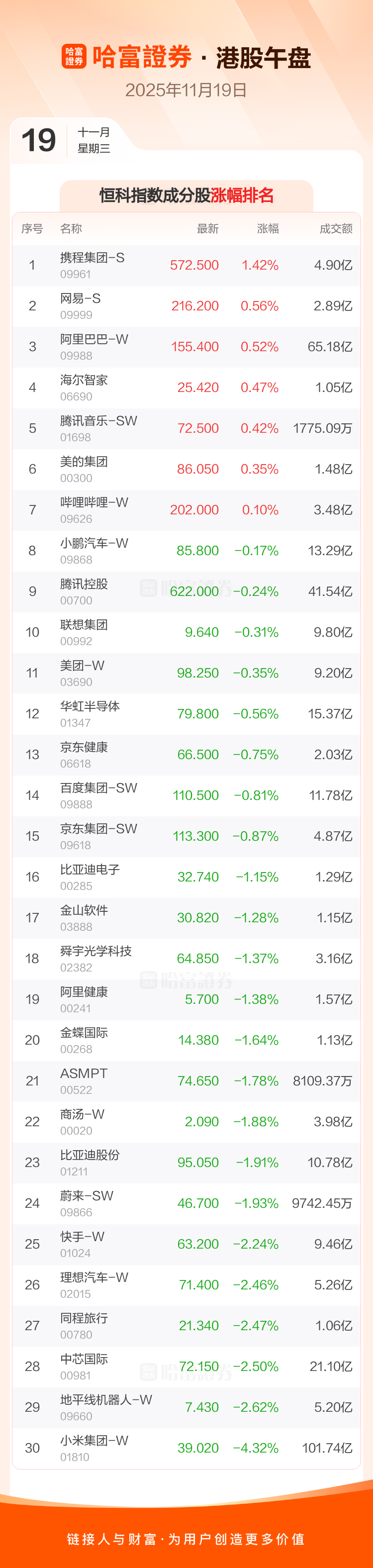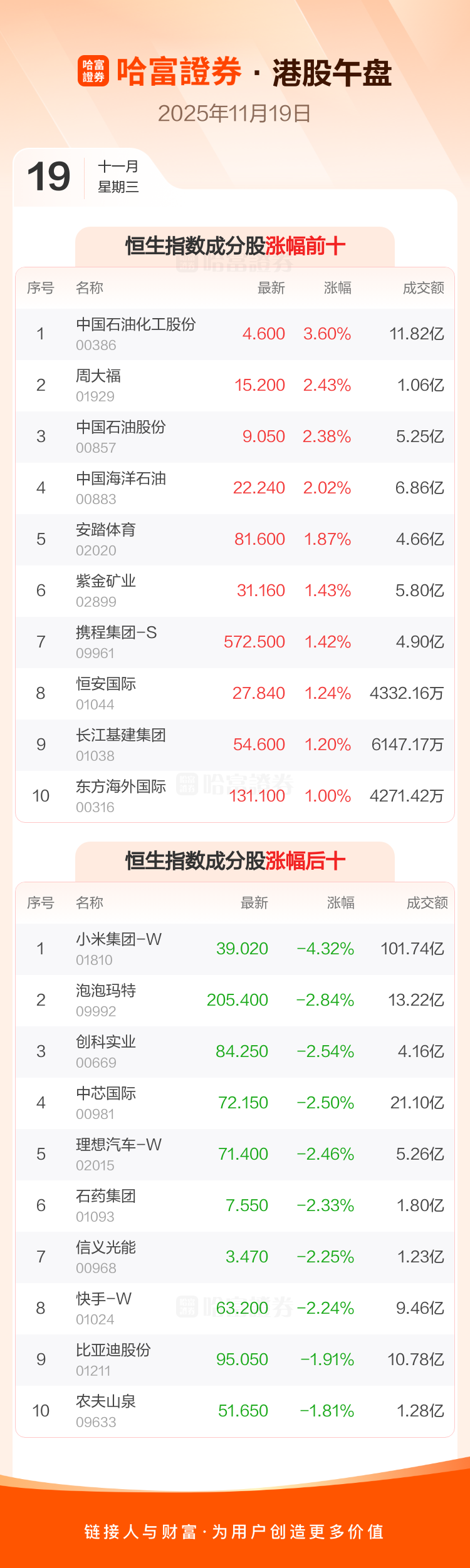 港股11月19日午盘走低,恒生指数收报25812.54点,跌117.49点,跌幅0.45%;恒生科技指数收报5590.45点,跌55.28点,跌幅0.98%。恒生指数成分股中中国石油化工股份、周大福、中国石油股份涨幅居前,小米集团-W、泡泡玛特、创科实业跌幅靠前。恒生科技指数成分股中携程集团-S、网易-S、阿里巴巴-W涨幅居前,小米集团-W、地平线机器人-W、中芯国际跌幅靠前。