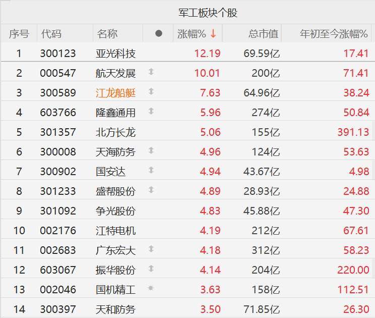 格隆汇11月19日|A股市场军工股活跃,其中,亚光科技涨超12%,航天发展(000547)10CM涨停,江龙船艇(300589)涨超7%,隆鑫通用(603766)、北方长龙涨超5%,天海防务(300008)、国安达、盛帮股份、争光股份、江特电机(002176)、广东宏大、振华股份(603067)涨超4%,国机精工、天和防务(300397)涨超3%。