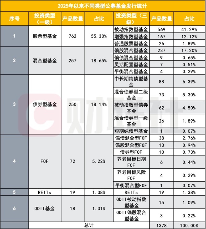 财联社11月19日讯(记者吴雨其)回顾今年以来公募基金市场的发行节奏,数据上的跃升已足以构成一道风景线。 据公募排排网统计,截至11月17日,今年以来全市场新发基金数量达到1378只,显著超过2024年全年1143只的总量,并创下近三年来的新高。这不仅打破了此前连续三年发行下滑的局面,也释放出基金公司与投资者对于资本市场新周期的共同期待。 更具代表性的信号来自发行周期的缩短。2025年新基金平均认购时间缩短至16.31天,较2024年同期的22.63天大幅压缩,显示出资金认购的积极性与发行效率的同步提升。 在市场热度升温的背后,不少业内人士将其归因于多重因素的叠加:宏观层面,经济企稳带动企业盈利预期修复;政策层面,流动性维持宽松为资金面提供支撑;结构层面,年轻一代投资者更倾向以低门槛、透明度高的公募基金参与资本市场。 但这场发行潮的结构性特征更值得审视。从发行类型分布看,今年权益类基金的发行占比高达72.5%,其中股票型基金与偏股混合型基金合计发行999只,重回市场主导地位;与此同时,指数化投资全面开花,今年发行的813只指数型基金中,被动指数型基金达646只,占指数型基金总量的79.46%,同时贡献了全市场新基的46.88%。 权益反攻、指数主导,被动投资重塑基金发行格局 在经历了连续三年发行数量下滑后,2025年新基金市场的“V型”反弹,首先体现在权益基金的迅速扩容。从公募排排网统计来看,截至11月17日,权益类新基金发行总量达到999只,其中股票型基金高达762只,占比55.3%,较去年同期增长逾六成,几乎回到2021年的高位。这一轮反弹的背后,既是权益市场表现回暖的直接映射,也体现了投资者风险偏好的边际上升。 尤其值得注意的是,在这762只股票型基金中,有多达736只是指数型基金,占该品类总数的96.59%。如果将视野扩展到所有新发基金,该数量已经占到整体的53.41%。 其中,被动指数基金569只,增强指数基金167只,两者几乎主导了全年的权益基金发行格局。“以往的主动与被动界限正在模糊,现在新产品中有近八成都不再追求个股选择,而是更强调贴近市场的低成本复制。”某大型公募产品部人士指出,尤其是在贝塔收益主导、市场有效性提升的背景下,主动策略的阿尔法空间被压缩,被动产品的吸引力进一步增强。 被动指数型产品的扩张不仅限于股票基金,债券市场也呈现出“指数化转型”的迹象。今年新发债券型基金共250只,其中有62只是被动指数债基,占比达到24.8%。而在QDII品类中,被动产品更是占据绝对主流,18只QDII新发产品中有15只为被动指数型,渗透率高达83.33%。 从整体结构来看,在今年发行的1378只新基中,指数型基金的数量达到813只,占到总量的59.00%。其中,被动指数型基金发行总数已达646只,占所有指数型基金的79.46%,占全部新基金的46.88%。这一趋势已不再是风格轮动下的阶段性现象,而是反映出指数型产品正逐步成为基金公司布局新产品时的基本盘。 一位华东地区头部基金公司投研负责人表示,指数化策略的高确定性和可规模复制特征,使得其在当前竞争加剧、渠道资源趋紧的背景下,更易于满足机构与渠道的双重需求,成为许多基金公司在新品立项中的优先选项。 值得一提的是,在主动策略面临挑战的同时,FOF基金凭借组合配置优势和资产配置能力,在今年实现了发行数量上的倍增。今年以来FOF基金新发数量为72只,较2024年的33只几近翻倍,尽管占比仍不高(5.22%),但已成为公募基金多样化发展的重要注脚。 细分来看,偏债混合型FOF以38只产品位居首位,其次是偏股混合型(13只)与债券型(10只)FOF,显示出FOF产品正逐步从养老专属向多元化资产配置工具转型。 ![]() 发行也现“股强债弱”,马太效应未变 公募基金发行数量的增长表象之下,不同类型产品与机构之间的发行力度差异也在放大,构成了另一条市场分野的分水岭。整体来看,今年新基金发行结构呈现出典型的“股强债弱”。债券型基金的发行数量不仅大幅低于股票型基金(250只对比762只),且较去年的330只明显萎缩。 值得注意的是,债券型基金近四年新基发行呈现明显的下滑趋势,算上今年,已经连续3年下降。这背后主要是因为权益市场的回暖,吸引了大量资金流入,投资者的风险偏好上升,更愿意将资金投入到收益潜力更高的权益类资产中。 而股票型基金的大量涌现,则得益于多个维度的支撑。一方面,权益市场的波动幅度加大,为趋势性产品提供了更强的操作空间;另一方面,A股结构性机会丰富,增强指数、行业主题ETF、量化策略型产品纷纷进入发行清单,满足了不同风险等级投资者的多元配置需求。 “权益类产品好发,不是因为大家盲目乐观,而是因为过去几年做了太多准备,一旦风口来了,马上就有产品能够接上。”一位熟悉基金发行策略的业内人士指出,特别是在年轻投资者偏好“主题投资+指数化配置”组合的推动下,指数型股票基金成为资金青睐的焦点。 从发行机构的维度看,强者恒强的格局并未改变。截至11月17日,共有131家公募机构参与了新基金发行。其中,仅有22家发行产品数量超过20只,集中度明显提升。富国基金以60只新基金发行量居首,其后依次是华夏(55只)、易方达(54只)、汇添富(53只)等头部机构。此外,永赢、鹏华、南方等公司发行数量均不低于40只,凸显了头部型机构在产品布局与渠道整合方面的领先优势。 不过,这种马太效应的另一面,是大量