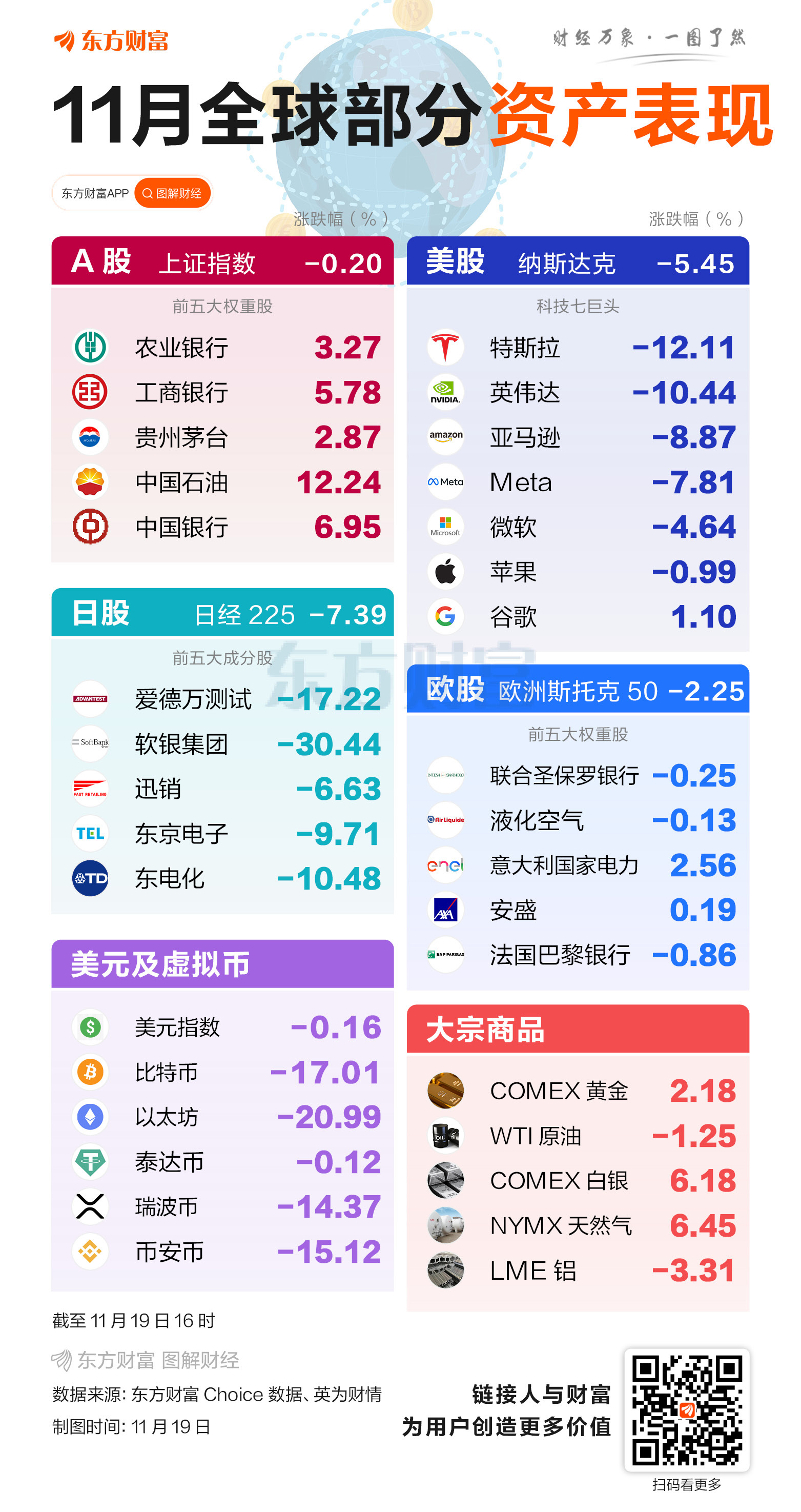 集体震荡!一图速览月内全球资产表现 炒股第一步,先开个股票账户 ![]() 进入11月以后,全球金融市场动荡,美股、日股、欧股、虚拟币、A股等全球主要资产均出现调整。截至北京时间11月19日16时,纳指当月跌超5%,日经225大跌7.39%,欧洲斯托克50下跌2.25%,沪指及恒指微跌约0.2%,比特币当月暴跌17%。 综合各大机构观点来看,当月全球资产出现的调整由多方面因素综合导致,包括美联储降息预期降温、日本国债收益率走高冲击全球流动性、地缘政治风险上升、大型科技股被抛售等。 芝商所美联储观察工具(CMEFedwatch)数据显示,当前华尔街投资者对12月降息的定价概率已降至50%附近,较一个月前近94%的峰值大幅回落。受降息概率变化的影响,全世界权益市场都遭到较大幅度的修正。 美股方面,近期部分机构投资者减持或清仓英伟达及其他科技巨头,巴克莱下调甲骨文债务评级,质疑AI资本开支可持续性。同时,AI产业增长也正受算力、配套设备与能源等基础设施瓶颈制约。利空侵袭之下,英伟达、亚马逊、META等美股科技巨头近期均大幅下跌。 日股方面,市场担忧日本首相高市早苗提出的扩张性财政政策会导致财政状况进一步恶化,日本国债遭投资者抛售。日本10年期国债收益率于11月19日盘中攀升至1.7%,创2008年金融危机以来新高,无风险收益率走高对权益市场流动性造成了一定冲击。 贵金属方面,美国政府停摆造成经济数据空窗,投资者风险偏好持续转弱,美元难以持续走强,为黄金提供一定支撑。与此同时,地缘局势同样成为金价反弹的重要推手,黄金月内累计涨幅超2%。