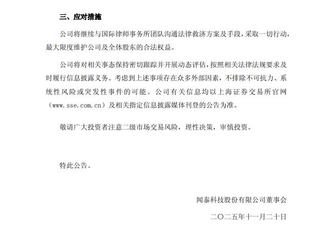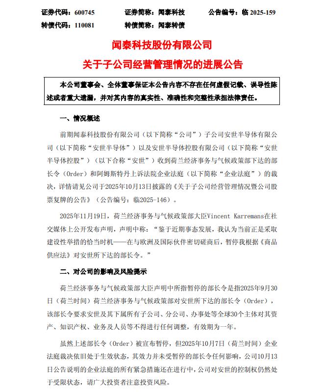 在丁冬财经看资讯行情,选丁冬财经证券一站式开户交易>> 闻泰科技(600745)11月19日公告,2025年11月19日,荷兰经济事务与气候政策部大臣Vincent Karremans在社交媒体上公开发布声明,声明中称:“鉴于近期事态发展,我认为当前正是采取建设性举措的恰当时机——在与欧洲及国际伙伴密切磋商后,暂停我根据《商品供应法》对安世所下达的部长令。” 虽然上述部长令(Order)被宣布暂停,但2025年10月7日(荷兰时间)企业法庭裁决依旧处于生效状态,其效力并未受暂停的部长令任何影响,公司10月13日公告说明的企业法庭的所有紧急措施还在进行中,公司对安世的控制权仍然处于受限状态,请广大投资者注意投资风险。 ![]() ![]()