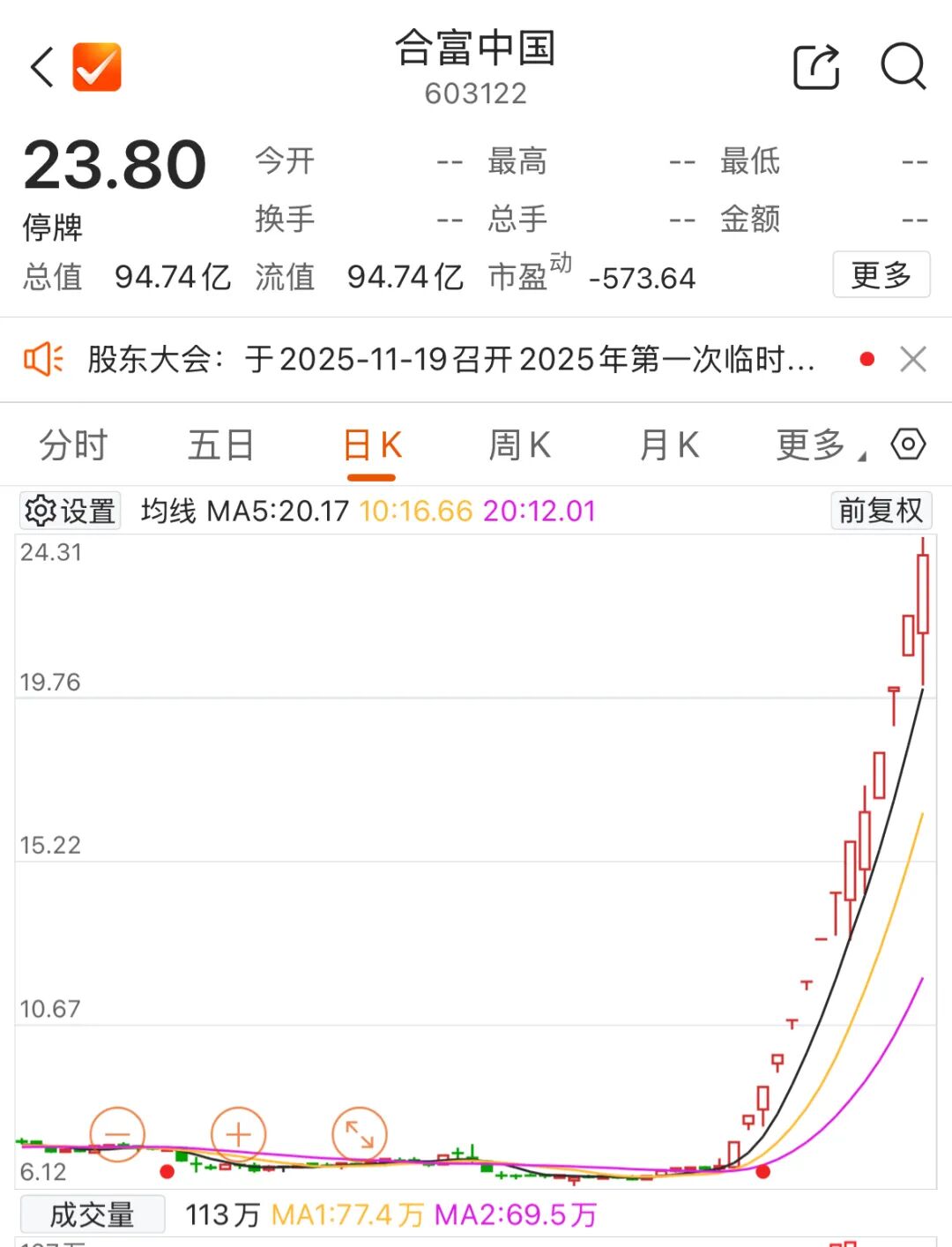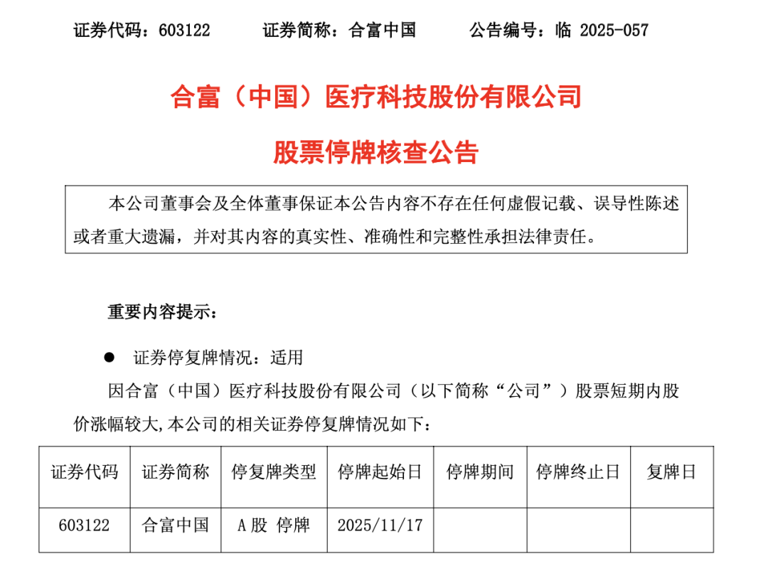 11月19日盘后,合富中国(603122)发布股票交易停牌核查结果暨复牌公告,公司股票将于2025年11月20日(星期四)复牌。 ![]() 公告显示,自2025年10月28日至2025年11月14日期间,公司股票连续十四个交易日中有十二个交易日以涨停价收盘,并5次触及股价异常波动、3次触及严重异常波动情形,期间累计涨幅高达256.29%。 合富中国提醒,股价短期内连续上涨,存在市场情绪过热、非理性炒作风险,随时存在快速下跌可能。 截至停牌前最后一个交易日,即11月14日,合富中国股价报23.80元/股,当天涨幅达7.69%,总市值为94.74亿元。 ![]() 期间累计涨幅高达256.29% 回溯来看,合富中国的本轮行情始于10月28日。自10月28日至11月14日期间,合富中国股票连续十四个交易日中有十二个交易日以涨停价收盘,并5次触及股价异常波动、3次触及严重异常波动情形,期间累计涨幅高达256.29%,已明显高于同期行业及上证指数涨幅。 11月13日,合富中国进一步提示,股价涨幅已严重显著偏离公司基本面,投资者参与交易可能面临较大风险;如公司股价继续异常上涨,可能申请停牌核查。 11月14日,合富中国继续大幅上涨,盘中一度触及涨停,换手率高达28.48%。为维护广大投资者利益,根据相关规定,经向上交所申请,公司股票于11月17日(星期一)开市起停牌。 ![]() 同时,合富中国最新市盈率水平显著高于同行业上市公司水平,当前股价存在明显泡沫化特征。截至11月14日,公司静态市盈率为343.67倍,根据同日中证指数有限公司网站发布的行业数据,公司所属的批发业的行业静态市盈率为30.94倍,存在公司股价严重偏离同行业上市公司合理估值的风险。 合富中国表示,本次股价连续上涨期间,公司股票流通换手率亦出现较大波动情形,击鼓传花效应明显。敬请广大投资者注意甄别、理性判断。