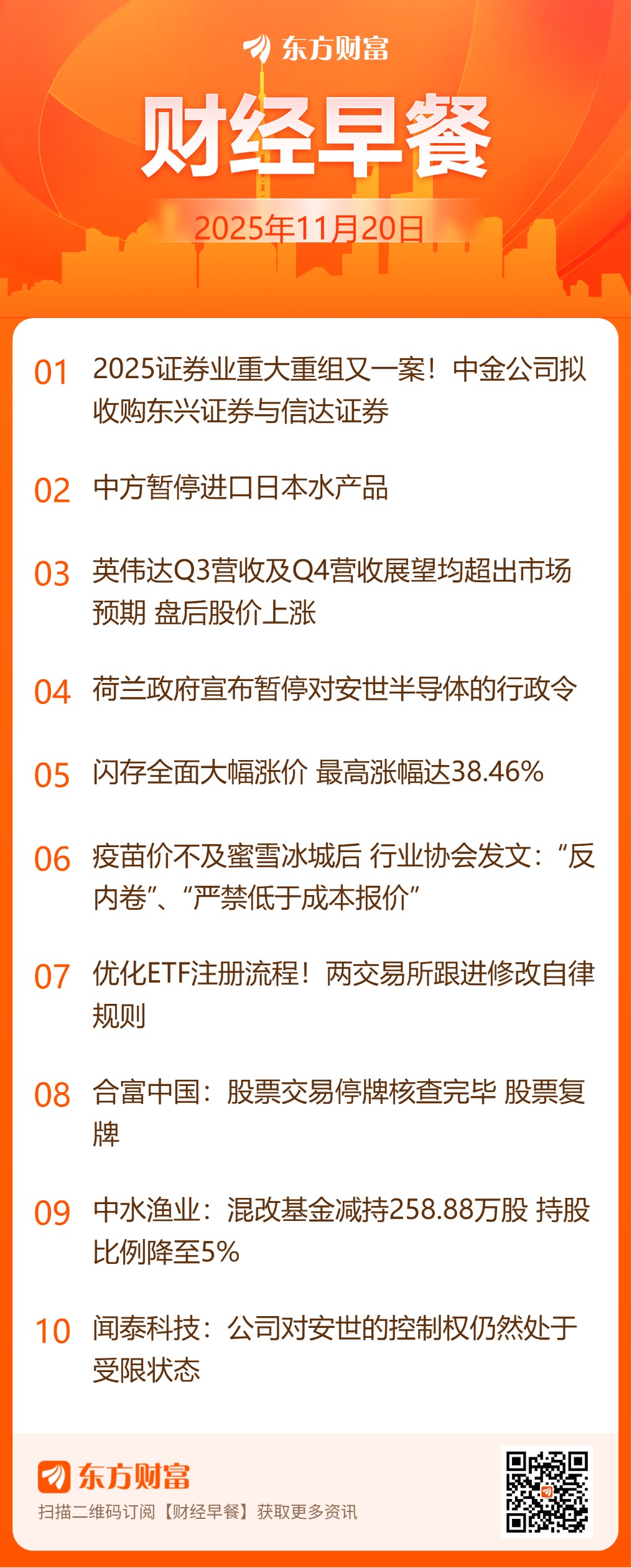 ![]() 每日精选中方停止进口日本水产品: 11月19日,外交部发言人毛宁主持例行记者会。有记者问:中国向日方通报暂停进口日本水产品,您能否介绍相关细节和原因?毛宁表示,近期由于日本首相高市早苗倒行逆施,在台湾等重大问题上发表错误言论,引起中国民众的强烈公愤。当前形势下,即使日本水产品向中国出口也不会有市场。 券商合并: 中金公司11月19日公告,公司与东兴证券、信达证券正在筹划由中金公司通过换股方式吸收合并东兴证券、信达证券。为保证公平信息披露,维护投资者利益,避免造成公司股价异常波动,公司A股股票将于2025年11月20日开市时起停牌,预计停牌时间不超过25个交易日。本次重组有助于加快建设一流投资银行,支持金融市场改革与证券行业高质发展。 英伟达财报: 英伟达第三财季营收570.1亿美元,同比增长62%,市场预期551.9亿美元;预计第四财季营收约为650亿美元,市场预期620亿美元。英伟达第三财季数据中心营收为512亿美元,同比增长66%,市场预期为493.4亿美元。英伟达第三财季调整后每股收益1.30美元。英伟达第三财季调整后营业利润为377.5亿美元,同比增长62%,市场预期为364.6亿美元。英伟达第三财季研发支出47.1亿美元,同比增长39%,市场预期为46.6亿美元。 安世半导体: 荷兰经济大臣卡雷曼斯19日发表声明,宣布暂停针对安世半导体的行政令。对此闻泰科技回应称,荷兰经济事务与气候政策部大臣声明中所指暂停的部长令是指2025年9月30日(荷兰时间)荷兰经济事务与气候政策部对安世所下达的部长令(Order),但2025年10月7日(荷兰时间)企业法庭裁决依旧处于生效状态,其效力并未受暂停的部长令任何影响,公司10月13日公告说明的企业法庭的所有紧急措施还在进行中,公司对安世的控制权仍然处于受限状态,请广大投资者注意投资风险。 中日关系: 外交部发言人毛宁19日在例行记者会上表示,日本首相高市早苗的涉台错误言论从根本上损害了中日关系的政治基础,激起了中国人民的公愤和谴责。如果日方拒不撤回甚至一错再错,中方将不得不采取严厉坚决的反制措施,由此产生的一切后果由日方承担。“中方严肃敦促日方收回错误言论,停止在涉华问题上制造事端,以实际行动认错纠偏,维护中日关系政治基础。” 制造业数智化升级: 中共中央政治局委员、国务院副总理张国清16日至19日在贵州、重庆调研制造业数智化转型升级、国有企业创新发展等工作。他强调,要认真学习贯彻党的二十届四中全会精神,深入贯彻落实习近平总书记重要讲话精神,准确把握新质生产力丰富内涵,加快制造业数智化转型升级,扎实推进国有企业创新发展,坚持优化提升传统产业、培育壮大新兴产业、前瞻布局未来产业并举,因地制宜发展新质生产力。 存储涨价: 继DRAM大幅涨价后,闪存(Flash)也全面涨价。据CFM闪存市场最新报价,11月19日,Flash Wafer(闪存晶圆)价格全面上涨,最高涨幅38.46%。具体来看,1Tb QLC涨25.00%至12.50美元,1Tb TLC涨23.81%至13.00美元,512Gb TLC涨38.46%至9.00美元,256Gb TLC涨14.58%至5.50美元。此外Counterpoint咨询发布研究报告,受关键芯片短缺影响,内存价格预计将在2026年第二季度之前,在当前基础上再上涨约50%。目前,传统LPDDR4面临的涨价风险最大。 疫苗行业反内卷: 据媒体报道,中国疫苗行业协会发布《关于反对“内卷式”竞争,促进疫苗及其相关生物制品行业高质量发展的倡议》。该倡议表示坚决抵制无序低价竞争,在招投标全流程中,严禁中国疫苗行业协会会员以低于成本的报价参与竞标,切实保障产品与服务的质量标准。该倡议倡导,中国疫苗行业协会会员以生产经营成本与市场供求状况为定价基本依据,依法自主合理定价,自觉维护市场价格稳定,共同营造公平有序的竞争环境。 ETF注册优化: 媒体记者获悉,证监会近日优化ETF注册及上市审核流程,取消了ETF注册环节提交证券交易所无异议函的要求,沪深交易所已相应修改了自律规则。这一举措意味着公募基金行业改革持续深化,通过简化ETF产品的注册发行上市流程安排,降低行业机构负担,释放市场活力,同时针对创新产品、复杂产品等特殊情况完善审慎监管安排。 热点题材水产养殖: 据媒体报道,日本媒体和专家担忧日中关系恶化,进一步冲击本已面临下行压力的日本经济。作为我国农产品贸易的重要伙伴,日本与我国在水产品、高端果蔬等领域长期保持密切贸易往来,相关领域的贸易变化将引发广泛关注。 AI玩具: 工业和信息化部11月19日举行新闻发布会,介绍GB6675《玩具安全》系列强制性国家标准修订情况,三个“下功夫”推动AI玩具产业高质量发展,成为会议的主要议题之一。工业和信息化部消费品工业司司长何亚琼表示,下一步,工信部将加强与相关部门的工作协同,共同推动AI玩具产业高质量发展。 羽绒: 据媒体报道,寒潮来袭,羽绒服迎来“涨价狂潮”。近日,青岛羽绒市场行业人士在接受记者采访时透露,现在养鸭子的特别少,羽绒价格一天一个价,90%的白鸭绒最低的时候1吨17万元,现在差不多58万元,鹅绒现在是98万元1吨,一件成人短款羽绒服,差不多需要100只鸭的绒,成本飙升致正规厂家出厂价逼近千元。 冰雪经济: 中国人民银行北京市分行等12部门印发《金融支持北京市提振和扩大消费的实施方案》,充分发挥首都“双奥之城”优势,鼓励金融机构围绕“赛事+”、冰雪经济等消费场景丰富金融