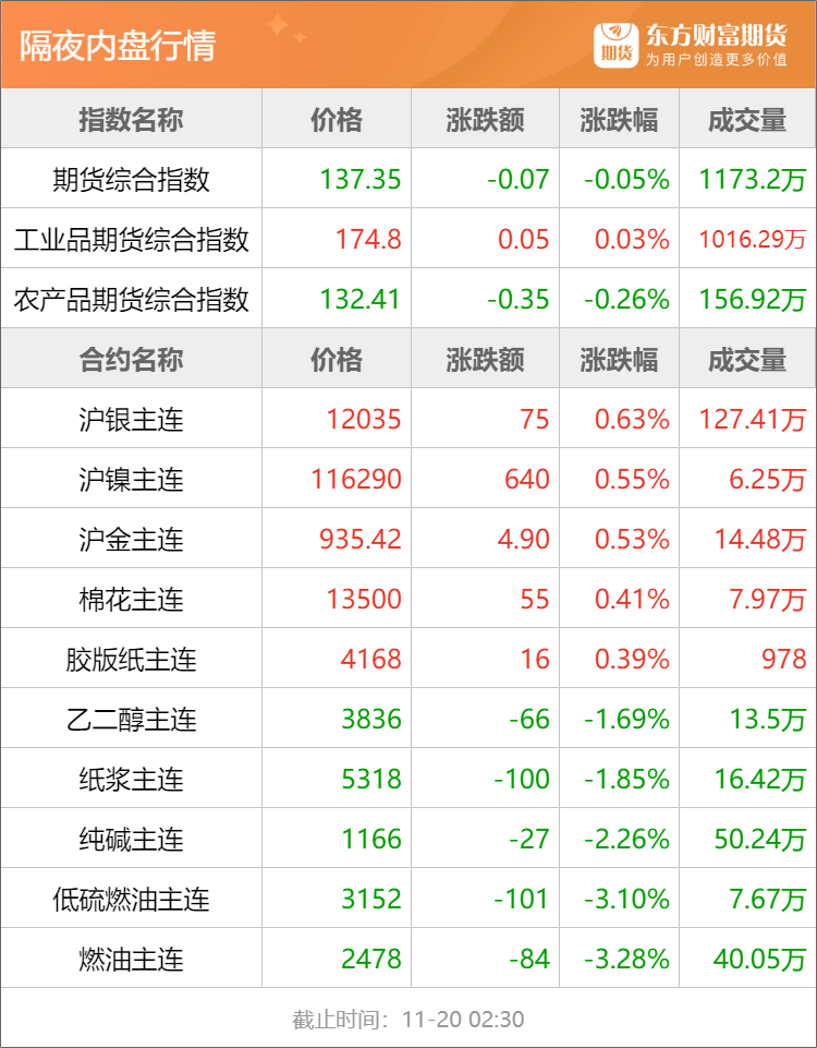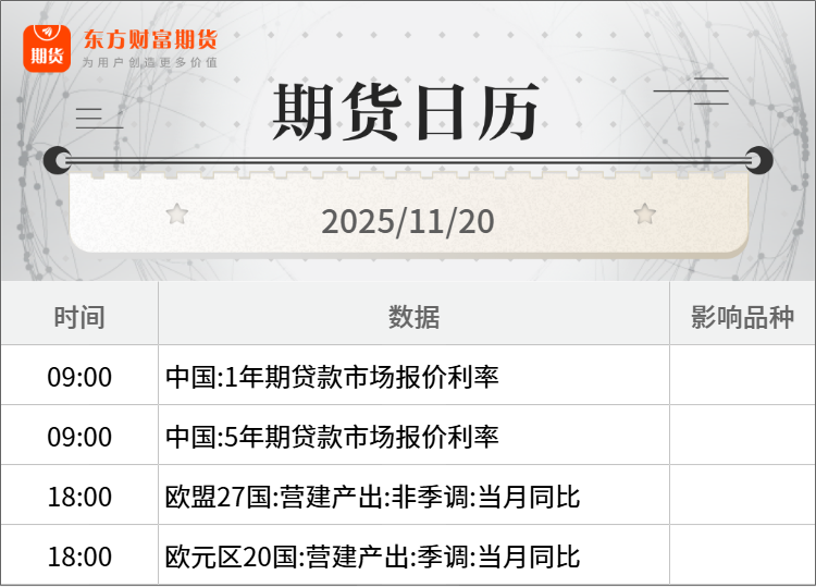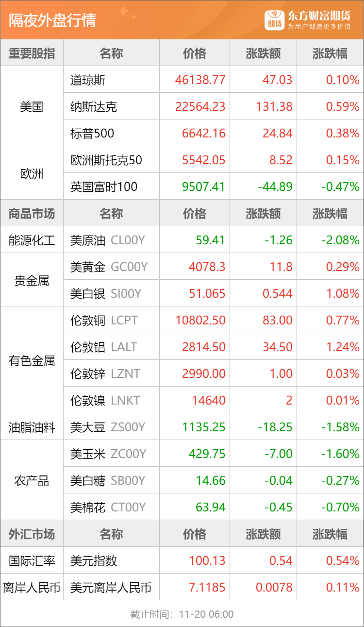 隔夜行情![]() ![]() 每日精选美联储10月会议纪要:决策者对12月是否降息存在较大分歧 黄金将继续闪耀!高盛:全球央行仍在“爆买” 明年有望冲击4900美元 远月合约全线破10万元/吨 碳酸锂期货“投机活跃度”创新高 宏观产经人民日报:11月19日,外交部发言人毛宁主持例行记者会。有记者问:中国向日方通报暂停进口日本水产品,您能否介绍相关细节和原因?毛宁表示,近期由于日本首相高市早苗倒行逆施,在台湾等重大问题上发表错误言论,引起中国民众的强烈公愤。当前形势下,即使日本水产品向中国出口也不会有市场。 人民日报:据外媒报道,荷兰经济大臣卡雷曼斯11月19日在社交媒体X上发声明表示,已暂停对安世半导体的干预。他说,“鉴于近期的事态发展,我认为现在是采取建设性步骤的正确时机。”卡雷曼斯当地时间13日表示,荷兰政府代表团将于“下周初”前往中国,寻求解决有关中国企业闻泰科技旗下安世半导体公司的问题。 新华社:中共中央政治局委员、国务院副总理张国清16日至19日在贵州、重庆调研制造业数智化转型升级、国有企业创新发展等工作。他强调,要认真学习贯彻党的二十届四中全会精神,深入贯彻落实习近平总书记重要讲话精神,准确把握新质生产力丰富内涵,加快制造业数智化转型升级,扎实推进国有企业创新发展,坚持优化提升传统产业、培育壮大新兴产业、前瞻布局未来产业并举,因地制宜发展新质生产力。 品种资讯黑色系期货 钢材:本周,唐山主流样本钢厂平均钢坯含税成本3091元/吨,周环比上调8元/吨,与11月19日当前普方坯出厂价格2970元/吨相比,钢厂平均亏损121元/吨,周环比减少32元/吨。(我的钢铁网) 据找钢网,截至11月19日当周,全国建材产量446.29万吨,环比增加10.03万吨;厂库414.85万吨,环比减少25.90万吨;社库490.64万吨,环比减少23.15万吨;总库存905.49万吨,环比减少49.05万吨;表需495.34万吨,环比增加28.91万吨。(新华财经) 铁矿石:截至11月19日12:00,江苏地区钢厂铁水与废钢价差相比,铁水比废钢价格高78元/吨。 据Mysteel,11月19日全国主港铁矿累计成交72.1万吨,环比上涨18.98%;本月平均每日成交104.9万吨,环比上涨5.43%。当天远期现货累计成交40.0万吨(5笔),环比下跌59.60%,其中矿山成交量为40万吨。(我的钢铁网) 农产品期货 大豆:近期中储粮国产大豆竞价销售持续进行,成交价较市场收购价基本持平。2025年11月18日,中储粮竞价销售2022年、2023年产国标二等国产大豆合计35692吨,底价3900元/吨;实际成交35692吨,成交率高达100%,均价3900元/吨,溢价0元/吨。(国家粮油信息中心) 玉米:巴西国家谷物出口商协会(ANEC)预计,11月巴西大豆出口量将达到471万吨,豆粕出口量将达到268万吨,玉米出口量将达到636万吨。(财联社) 生猪:自2024年6月起,全国能繁母猪存栏维持在4000万头以上,接近正常保有量的绿色区间上限。而我国生猪价格在10月份均价已经跌至11.22元/公斤,创年内新低。并且,这一价格已经覆盖不了生猪养殖的成本线。(中国经营报) 有色/贵金属期货 碳酸锂:电池级碳酸锂指数价格89837元/吨,环比上一工作日上涨1870元/吨;电池级碳酸锂8.54-9.24万元/吨,均价8.89万元/吨,环比上一工作日上涨1500元/吨;工业级碳酸锂8.46-8.84万元/吨,均价8.65万元/吨,环比上一工作日上涨1450元/吨。(SMM) 多晶硅:11月19日,Mysteel报价显示,主流厂商恢复有机硅DMC报价,此前停盘的厂商如今报价上调至1.32万元/吨,较停盘前的1.13万元/吨大幅上涨。鲁西厂商近期没有停盘,选择持续报盘,11月19日报价维持在1.3万元/吨,与18日持平。(中证金牛座) 沪铜:伦敦金属交易所(LME)铜库存单日增加16,575吨,创自7月以来最大涨幅;铝库存单日减少31,450吨,创自9月以来最大降幅。(财联社) 能化期货 原油:联合石油数据库(JODI)的数据显示,9月沙特原油出口量环比增加5.3万桶/日,至646万桶/日;9月沙特阿拉伯国内炼油厂原油加工量增加3.8万桶/日,至294万桶/日。(新华财经) 甲醇:据隆众资讯,截至2025年11月19日,中国甲醇港口库存总量在147.93万吨,较上一期数据减少6.43万吨。其中,华东地区去库,库存减少3.86万吨;华南地区去库,库存减少2.57万吨。(隆众资讯) 沥青:截至11月18日当周,国内沥青54家企业厂家样本出货量共37.0万吨,环比增加2.2%。分地区来看,东北以及山东地区增加明显,东北地区区内低硫沥青产量增加,同时炼厂降价刺激出货,支撑出货量增加;而山东地区终端需求有所支撑,加之个别炼厂集中交付合同,均带动本周出货量增加。(隆众资讯) 环球视野财联社:淡马锡CEO狄澜警告,美元走弱正降低美国资产吸引力,该机构今年加大了对冲力度,但对冲成本已高到难以承受。狄澜称,美元疲软对非美元计价投资者是大问题,或影响资本市场。他认为人工智能估值过高存在风险。 财联社:欧元区10月CPI同比增长2.1%,预期2.10%,前值2.10%。 每日关注![]() (文章来源:丁冬财经研究中心) |