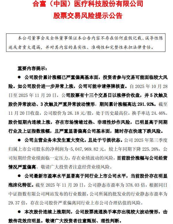 全新妙想投研助理,立即体验 合富中国晚间公告,公司股价累计涨幅已严重偏离基本面,投资者参与交易可能面临较大风险。如公司股价进一步异常上涨,公司可能申请停牌核查。自2025年10月28日至2025年11月20日,公司股票有十三个交易日以涨停价收盘,并5次触及股价异常波动、3次触及严重异常波动情形,期间累计涨幅高达291.92%。截至11月20日收盘,公司股价为26.18元/股,处于历史最高位,换手率达24.46%。股价短期内连续上涨,存在市场情绪过热、非理性炒作风险,已明显高于同期行业及上证指数涨幅,且严重显著偏离公司基本面,随时存在快速下跌风险。 ![]()