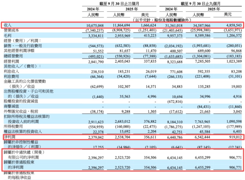 反内卷政策下,快递龙头企业称“快递业整体价格水平企稳回升”。 11月20日,中通快递(ZTO.N,2057.HK)公布2025年第三季度未经审计的财务业绩。财报显示,三季度实现营收118.65亿元,同比增长11.1%。其中,第三季度核心快递服务收入同比增长11.6%,增长是由于包裹量增长9.8%及包裹单价增长1.7%所致。 盈利水平方面,第三季度实现净利润为25.39亿元,同比增长6.7%;归母净利润为25.24亿元,同比增长5.3%;调整后净利润为25.06亿元,同比增长5%。毛利率为24.9%,去年同期为31.2%,同比下降6.3个百分点。 前三季度来看,中通实现营收345.88亿元,创历史新高,同比增长10.3%;实现归母净利润为64.55亿元,同比增长0.33%。 ![]() 在电话会上,中通创始人、董事长兼首席执行官赖梅松指出,三季度政府提倡反内卷和基础民生保障,引导有序竞争,遏制不合理的低价行为,快递业整体的价格水平企稳回升。 中通首席财务官颜惠萍在财报中介绍,中通核心快递单票收入提升0.02元。其中增量补贴增加0.14元、单票重量下降影响0.02元,而KA客户单价提升0.18元则抵消了前述影响。单票分拣与运输成本合计下降0.05元,主要得益于运输成本的效益提升。管理费用结构保持稳定,占收入比重为5.3%;经营性现金流增长3.2%,达到32亿元;本季度资本支出为12亿元。 “中通会预期明年全链路的成本仍有下降空间。”赖梅松在电话会指出,公司会继续加强数字化、智能化的能力建设,并合理分配好收转运派每段的成本优化,成本方面有信心在行业保持领先。 颜惠萍还指出,基于对第四季度行业趋势的预判,中通将全年业务量指引下调至382亿至387亿件区间,对应同比增速为12.3%至13.8%。 “进入四季度,行业整体业务量增长有所放缓,尽管宏观经济的复苏存在不确定性和短期的挑战,快递和物流行业的长期发展前景依然是广阔的,我们将持续专注于自身产品和服务能力的建设。”在电话会上,赖梅松表示,宏观经济之下低价包裹占比的提升,给中通这样的头部企业带来了特殊的新课题。面对生意的结构性变化,中通将在合理盈利区间持续拓展业务规模。与此同时,加盟合作伙伴也在经历着白热化价格竞争的锤炼,正积极通过末端能力建设与模式创新,开拓多元化收入来源,持续优化经营效益。 赖梅松进一步指出,中通三季度散件业务量同比增速接近50%,非电商件量的增长保持了高速增长的态势,持续为利润带来积极贡献。赖梅松还表示,快递只是物流的一部分,中国的物流市场更大。中通除了有快递业务以外,生态圈还有快运、冷链仓以及兔喜,“我们相信未来的竞争一定是综合物流的竞争,是全方位的竞争,中通不仅服务电商,更要服务制造业,服务现代农业和商业,这是公司的第二条发展曲线。” 谈及反内卷政策的推进,赖梅松指出,今年8月起快递行业推行的反内卷政策已局部在全国部分地区落实,推动价格理性回归,预计这一趋势有持续性,市场价格将维持在成本线以上,竞争趋于良性。随着反内卷的推进、价格的回升,轻小件、低客单价件的占比在减少,中通会根据各地的产能配置相应的资源,比如中西部地区,会根据仓位的调配,会适当在公斤段上进行调整。 在电话会上,针对此前的监管通报,赖梅松回应称,预计监管机构将继续鼓励优质发展,规范市场行为的思路。一方面政策会继续鼓励企业通过技术、管理和服务创新来提升核心竞争力。另一方面对于可能损害用户权益,影响末端稳定的行为,监管也会保持高度关注并适时介入。中通作为头部企业,深刻理解并积极响应这一监管导向,将主动承担更多示范引领责任。 “中通已将合规经营提升到战略高度。”赖梅松在电话会上进一步指出,监管部门约谈中通,在短期内是对中通管理精细度的一次重要提醒和压力测试。公司高度重视这些反馈,并已将此转化为内部优化升级的趋势,“我们正在全面审视并进一步强化在服务质量末端稳定及合作伙伴支持等方面的体系建设。” 据“国家邮政局”微信公号,10月28日,国家邮政局约谈中通快递股份有限公司,指出中通快递经营行为不规范,随意调整运营规则,存在服务质量不高、快递员合法权益保障措施落实不到位等问题,要求该公司严格落实中通快递服务网络管理主体责任,改进快递服务质量,强化合规经营体系建设,保障快递员合法权益,自觉维护公平竞争市场秩序。当天,对于被国家邮政局约谈一事,中通快递方面回应澎湃新闻记者称,“中通会严格按照约谈要求,针对涉及的问题,全面排查、全面整改、全网落实。进一步提升服务质量,提升合规经营,提升网点和员工的合法权益保障。” 截至11月20日收盘,中通快递港股(2057.HK)报149.3港元/股,涨1.22%,今年年初至今涨2.27%。