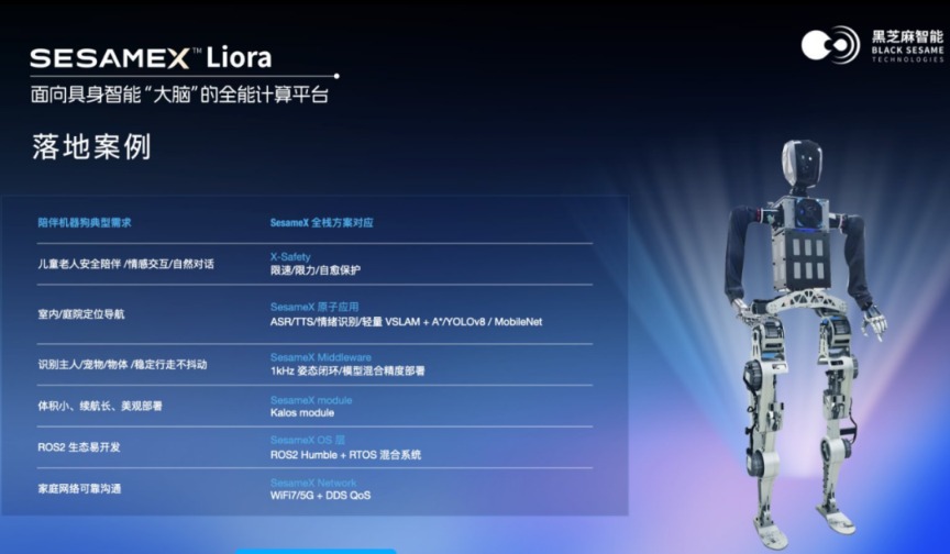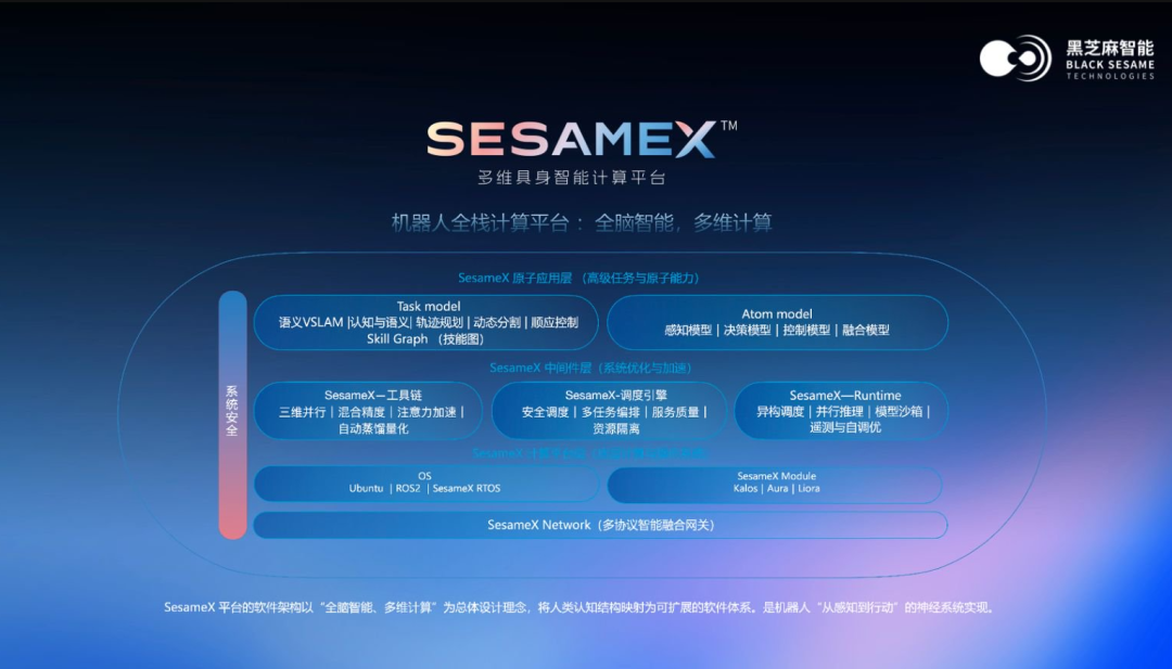 随着AI大模型发展,具身智能机器人成为了时代的新风口。 然而,大小脑,左右脑不平衡;安全无系统保障,缺乏从芯片层到系统层的安全机制;系统割裂,多任务算力不协调;算法难闭环进化,每到新环境就要重新训练……说起来机器人行业的四大技术痛点,单记章表示,这些问题的出现并非单纯因为算力不够,而是没有合理的架构支持,缺少真正理解、规划、控制、安全协同的“神经系统”。 针对行业痛点,黑芝麻智能打造的SesameX是业界首个全栈自进化、支持全脑智能的机器人商业化部署平台。SesameX是一整套“从端侧模组到全脑智能的体系化计算平台”,从硬件、软件、工具链到模型生态,全栈自研。 ![]() 黑芝麻智能机器人业务负责人徐劲介绍,SesameX系统由底层计算平台、中间件层、原子应用层等构成;其中,底层计算平台由公司自研的Kalos、Aura、Liora三款核心计算模组组成,分别对应机器人发展的三个层级——视觉驱动、感控协同与认知进化,共同构建出完整的机器人智能阶梯,满足不同类型机器人的需求。 徐劲介绍,Kalos是最成熟、最具性价比的机器人中枢,兼顾视觉感知与运动控制,让机器人“看得清、动得稳”;可广泛应用于送餐机器人、迎宾机器人、巡检机器人、清洁机器人、教育机器人等低速轮式场景。 ![]() Aura是SesameX平台家族中最聪明、最可靠的机器人行动脑,让机器人“看懂世界,精准行动”;适用于多足机器人、巡检维护机器人(工业、电力、港口)、智能机械臂、协作机械臂、人形或遥操作机器人等。 作为面向具身智能“大脑”的全能计算平台,Liora是SesameX平台家族中最快、最安全的机器人大脑,支持世界模型与端到端控制,让机器人“思考、预测并自主决策”;适用于具身智能的人形机器人场景,包括服务或教育人形机器人、双臂协作机器人、情感交互机器人等。 ![]()