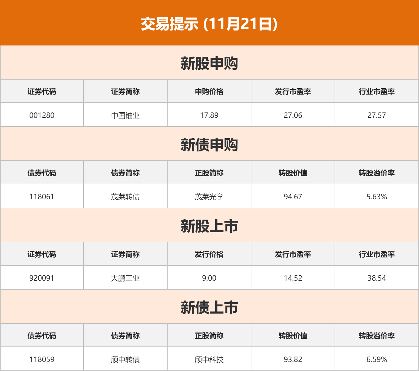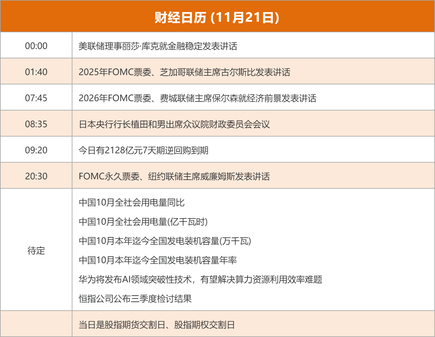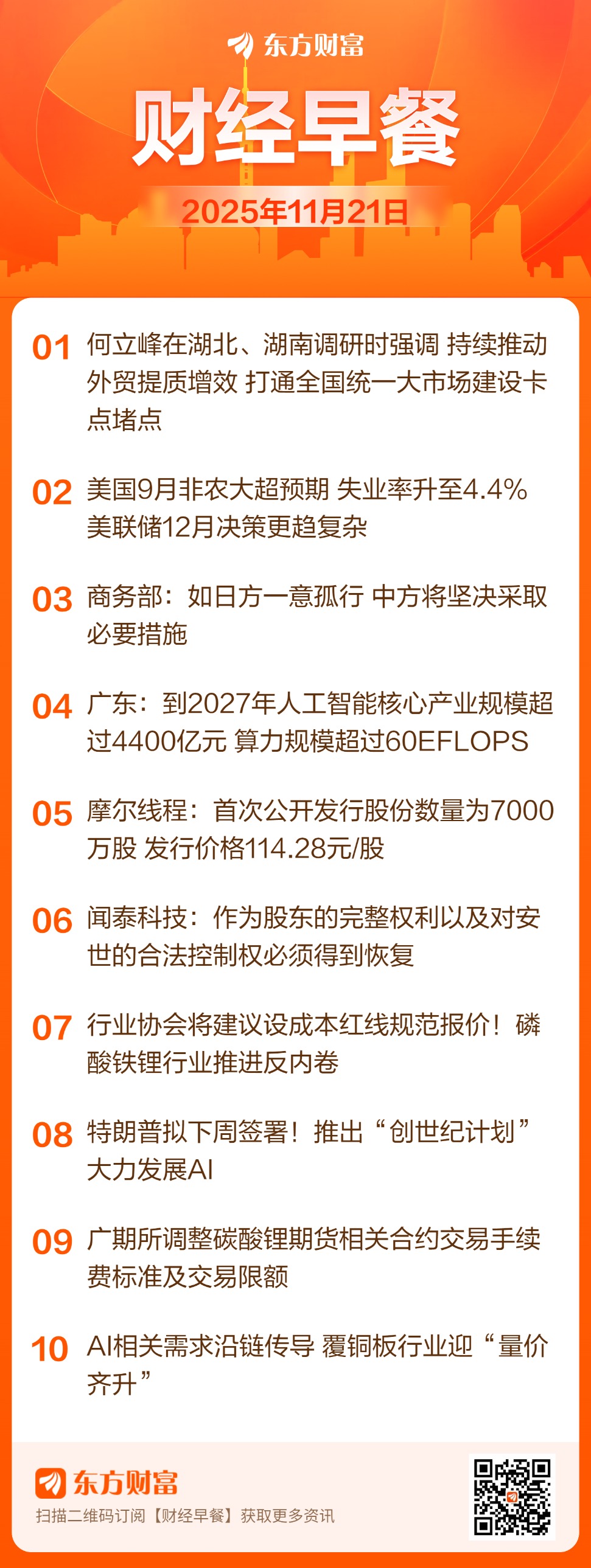 ![]() 每日精选统一大市场: 中共中央政治局委员、国务院副总理何立峰11月18日至20日到湖北、湖南调研。何立峰指出,要持续推动外贸提质增效,完善高标准物流体系建设,加力支持制造业高质量发展,加快构建全国统一大市场,进一步畅通国内国际双循环。此外还提到,要支持跨境电商等新业态新模式发展和海外仓建设,持续推动外贸市场多元化,继续保持外贸平稳增长。 美国9月非农数据: 美国9月非农就业人数增加11.9万人,市场预估为增加5.2万人,前值为增加2.2万人。美国9月失业率为4.4%,预估4.3%,前值为4.3%。利率互换市场继续显示,美联储12月降息的可能性不大。最新经济数据出炉后,交易员加大了对美联储降息的押注,但仍预计美联储将跳过12月降息。 中日关系: 有媒体提问称,中方是否考虑依据《中华人民共和国反外国制裁法》等相关法律法规,对日本相关的个体、个人或实体采取经济反制措施?对此,商务部新闻发言人何咏前表示,中方敦促日方本着对历史和中日关系负责任的态度,收回错误言行,切实履行对华承诺,为两国经贸合作创造良好环境。如果日方一意孤行,继续在错误的道路上越走越远,中方将坚决采取必要措施,一切后果由日方承担。 算力: 广东省人民政府印发《广东省国家数字经济创新发展试验区建设方案(2025-2027年)》提出,到2027年,数字经济发展水平稳居全国首位,数字经济核心产业增加值占GDP比重超过16%,打造3个具有国际竞争力的万亿级数字产业集群,培育若干高价值数字产业新赛道,数据产业规模年均复合增长率超15%,人工智能核心产业规模超过4400亿元,规模以上工业企业数字化转型突破6万家,算力规模超过60EFLOPS(每秒浮点运算次数),将广东打造为国际一流数字经济发展高地,将粤港澳大湾区建设为全球数字化水平最高的湾区。 摩尔线程即将打新: 摩尔线程晚间公告,首次公开发行股票并在科创板上市,发行股份数量为7000万股,全部为公开发行新股。本次网上发行与网下发行将于2025年11月24日(T日)分别通过上交所交易系统和互联网交易平台实施。发行价格为114.28元/股,预计募集资金总额为80亿元,扣除发行费用后,预计募集资金净额为75.76亿元。 磷酸铁锂行业反内卷: 据媒体报道,由于我国磷酸铁锂行业陷入连续多年整体性亏损的窘境,产业无序竞争、低价内卷现象威胁全行业生存根基与持续发展大局,中国化学与物理电源行业协会将发布《关于参考磷酸铁锂成本指数及规范行业发展的通知》。该《通知》建议,企业应将协会11月18日披露的行业平均成本区间作为报价的重要参考,不要突破成本红线开展低价倾销。 覆铜板: 据媒体报道,记者多方采访获悉,AI驱动高端PCB需求激增,作为PCB关键基材的覆铜板迎来结构性机遇,部分高阶品类成为紧俏货,价格同步上涨。建滔积层板等厂商年内已多次提涨产品价格,成本压力、需求红利成为涨价的重要推手。南亚新材和华正新材公司证券部工作人员均称,目前产能利用率处于高位,10月份有过调价动作。 AI芯片: 日前,彭博社爆料称,美国总统特朗普计划于下周一在白宫签署一项行政命令,推出“创世纪计划”,以加强美国的人工智能发展。另有媒体报道称,白宫主要官员正在向国会山的议员施压,要求将限制人工智能芯片出口的法案排除在年度国防政策法案之外。消息称,如果《GAIN AI法案》没有成为《国防授权法案》的最终版本,英伟达将成为最大的受益者。 碳酸锂期货: 广期所调整碳酸锂期货相关合约交易手续费标准及交易限额,自2025年11月24日交易时起,碳酸锂期货LC2601合约的交易手续费标准调整为成交金额的万分之三点二,日内平今仓交易手续费标准调整为成交金额的万分之三点二;碳酸锂期货LC2602、LC2603、LC2604、LC2605合约的交易手续费标准调整为成交金额的万分之一点六,日内平今仓交易手续费标准调整为成交金额的万分之一点六。11月20日碳酸锂主力合约价格继续大涨,盘中最大涨幅超过4%,一度涨至10.25万元/吨,持续刷新年内高点。 热点题材消费: 为释放消费潜力、扩大国内需求,财政部、商务部联合开展的消费新业态新模式新场景试点工作迎来关键进展。11月20日,两部委正式公示50个拟入选试点城市名单,4个直辖市、5个计划单列市全部入选,其余41个城市覆盖全国主要省份。 核电: 据多家日媒19日报道,日本预计本周将批准重启该国最大核电站——新潟县柏崎刈羽核电站。据日本共同社和《日本经济新闻》援引未具名消息人士的话说,柏崎刈羽核电站预计将于本周获得当地知事的批准,恢复运行。 OCS交换机: 谷歌发布的Gemini 3 Pro在多方评测中都备受好评,测试数据在一众大模型中一骑绝尘。架构上,谷歌借助OCS组网提高了集群整体效率。OCS交换机利用光信号直接传输数据,避免了信号的转换过程,从而减少了延迟和能量消耗,因此适用于大规模数据中心之间的高速互联,尤其是在跨区域扩展和大规模AI算力需求下表现出极大优势。 存储: 行业媒体报道,市场调查机构CounterPointResearch近日发布博文,示警全球内存市场正面临严峻的价格上涨压力。报告预测,继今年价格已飙升50%之后,动态随机存取存储器(DRAM)的价格在2025年第四季度可能再上涨30%,并在2026年初进一步上涨20%。综合来看,到2026年第二季度,内存价格相较于当前水平,累计涨幅可能高达50%。 AI应用: 据媒体报道,OpenAI与Target携手,将新的AI