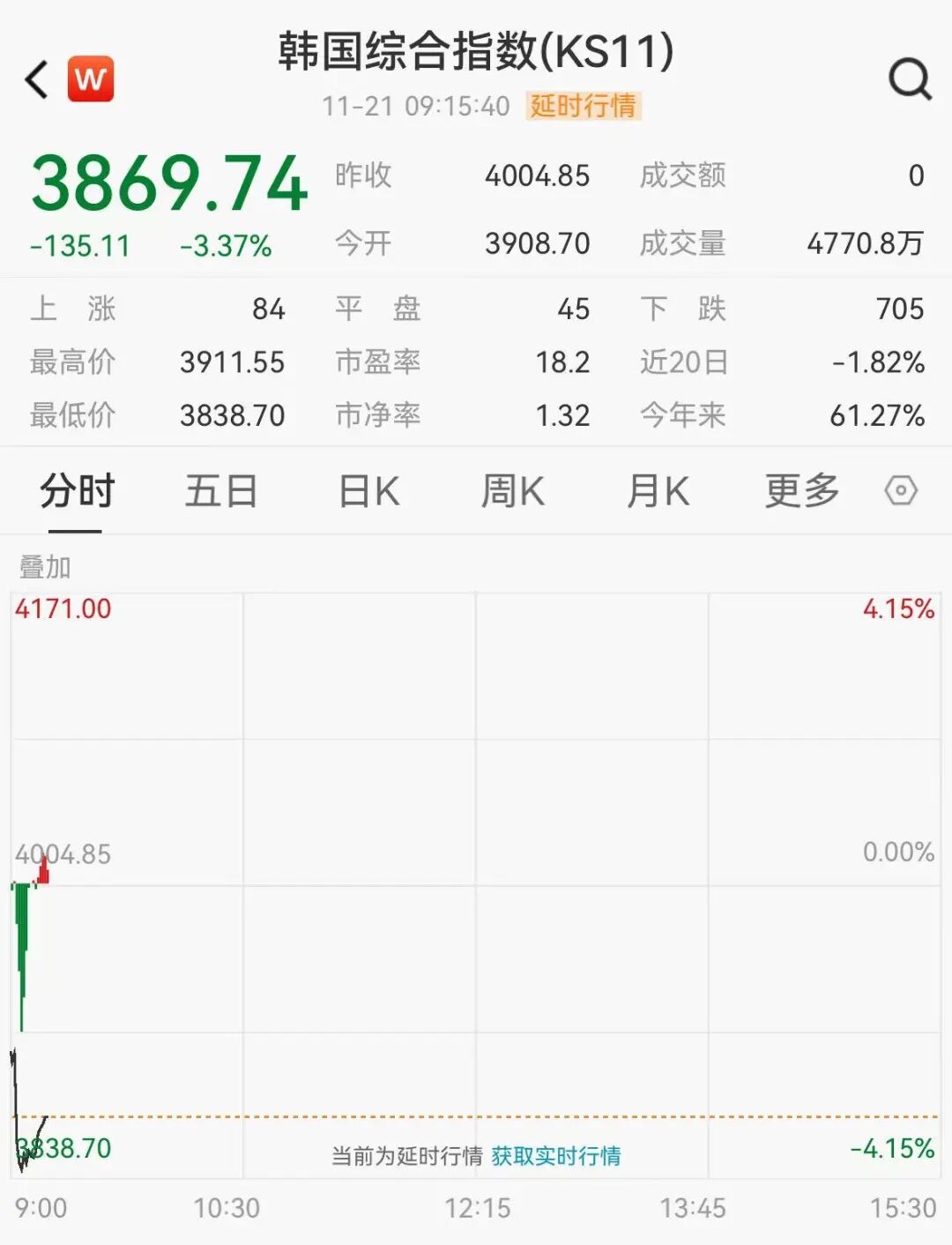 日韩股市大跳水 软银跌11% 三星跌超4% 海力士跌超7%