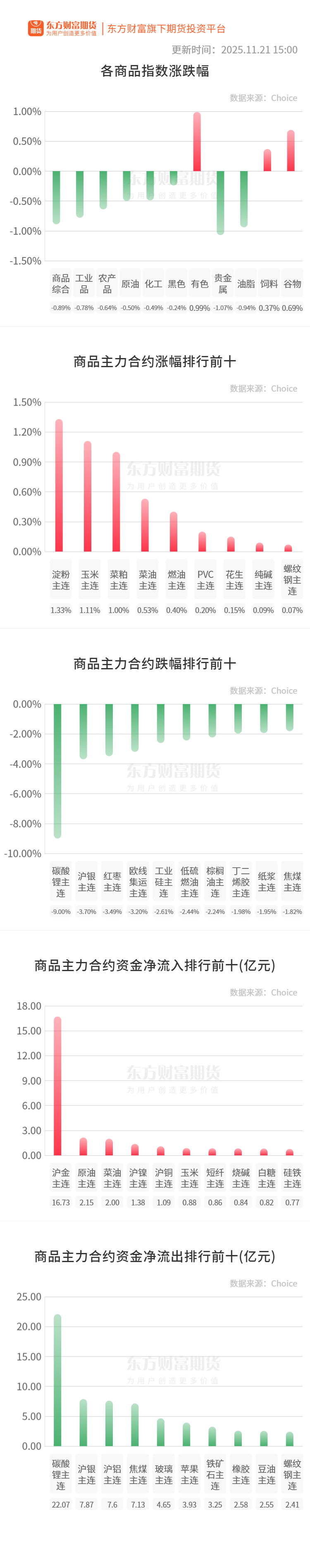 行情纵览![]() 宏观产经证券时报网:昨晚,美股尾盘大跳水,今早亚太股市全线暴跌。虚拟币市场更是发出强烈的空头指引。A股和港股开盘,也是大幅杀跌。全球流动性似乎出现了问题。从根源上看,美联储的预期管理和日本国债市场动荡,是本轮全球市场杀跌的主要源头。就这刚刚,这两大变量皆出现了有利于市场演绎的积极信号。 国家能源局:10月份,全社会用电量8572亿千瓦时,同比增长10.4%。分产业看,第一产业用电量120亿千瓦时,同比增长13.2%;第二产业用电量5688亿千瓦时,同比增长6.2%,其中,工业用电量同比增长6.4%;第三产业用电量1609亿千瓦时,同比增长17.1%,其中,充换电服务业以及信息传输、软件和信息技术服务业用电量增长较快;城乡居民生活用电量1155亿千瓦时,同比增长23.9%。 品种资讯黑色系期货 钢材:247家钢厂高炉开工率82.19%,环比上周减少0.62个百分点,同比去年增加0.26个百分点 ;高炉炼铁产能利用率88.58%,环比上周减少0.22个百分点 ,同比去年增加0.05个百分点;钢厂盈利率37.66%,环比上周减少1.30个百分点,同比去年减少16.89个百分点;日均铁水产量 236.28万吨,环比上周减少0.60万吨,同比去年增加0.48万吨。(Mysteel) 铁矿石:全国45个港口进口铁矿库存总量15054.65万吨,环比下降75.06万吨;日均疏港量329.92万吨,增2.97万吨;在港船舶数量120条,增4条。(Mysteel) 农产品期货 菜籽:加拿大谷物委员会发布的数据显示,截至11月16日当周,加拿大油菜籽出口量较前周增加134.8%至28.46万吨,之前一周为12.12万吨。(新华财经) 玉米:截至2025年11月19日,全国12个地区96家主要玉米加工企业玉米库存总量272.7万吨,降幅0.29%。(Mysteel) 生猪:截至11月21日14:00时,全国农产品批发市场猪肉平均价格为17.91元/公斤,较前一日下降0.2%;鸡蛋平均价格为7.26元/公斤,较前一日下降0.1%。(农业农村部) 有色/贵金属期货 黄金:11月21日,多家黄金珠宝品牌公布的境内足金饰品价格较前一日仍在1300元/克左右,但价格调整幅度出现分化。(上海证券报·中国证券网) 多晶硅:截至11月21日,本周多晶硅(N型致密料)市场均价50元/千克,即期制造成本约40.27元/千克,即期单公斤净利约为9.73元/千克。价格方面,本周多晶硅N型致密料均价环比持平。成本方面,工业硅粉价格下滑,成本环比下降0.16元/千克。本周多晶硅环节净利润环比上涨0.16元/千克。(Mysteel) 工业硅:11月21日,SMM华东不通氧553#在9300-9400元/吨;通氧553#在9500-9600元/吨;521#在9600-9800元/吨;441#在9700-9800元/吨;421#在9700-9900元/吨;421#有机硅用在9800-10200元/吨;3303#在10400-10600元/吨。天津、西北地区个别硅价下调。昆明、黄埔港、新疆、四川、上海地区硅价持稳。97硅今日价格同样持稳。(SMM) 能化期货 原油:本计价周期(2025年11月10日24时至2025年11月24日24时)以来,国际原油呈现宽幅震荡行情,受此影响,国内参考的原油变化率在负值范围内波动,第9个工作日计算后的下调幅度在55元/吨,略高于50元/吨的成品油调价红线。考虑到目前距离调价窗口仅剩一个工作日,且原油或继续低位震荡,预计下周一(11月24日)24时,国内成品油零售限价压线下调概率较大。(新华财经) 尿素:山东地区尿素行情小幅上涨,小颗粒主流出厂成交1610-1640元/吨,大颗粒出厂成交1840元/吨。临沂市场一手贸易商出货参考价格1650元/吨附近,菏泽市场参考价格1630元/吨附近。(隆众资讯) 晚间关注无 (文章来源:丁冬财经研究中心) |